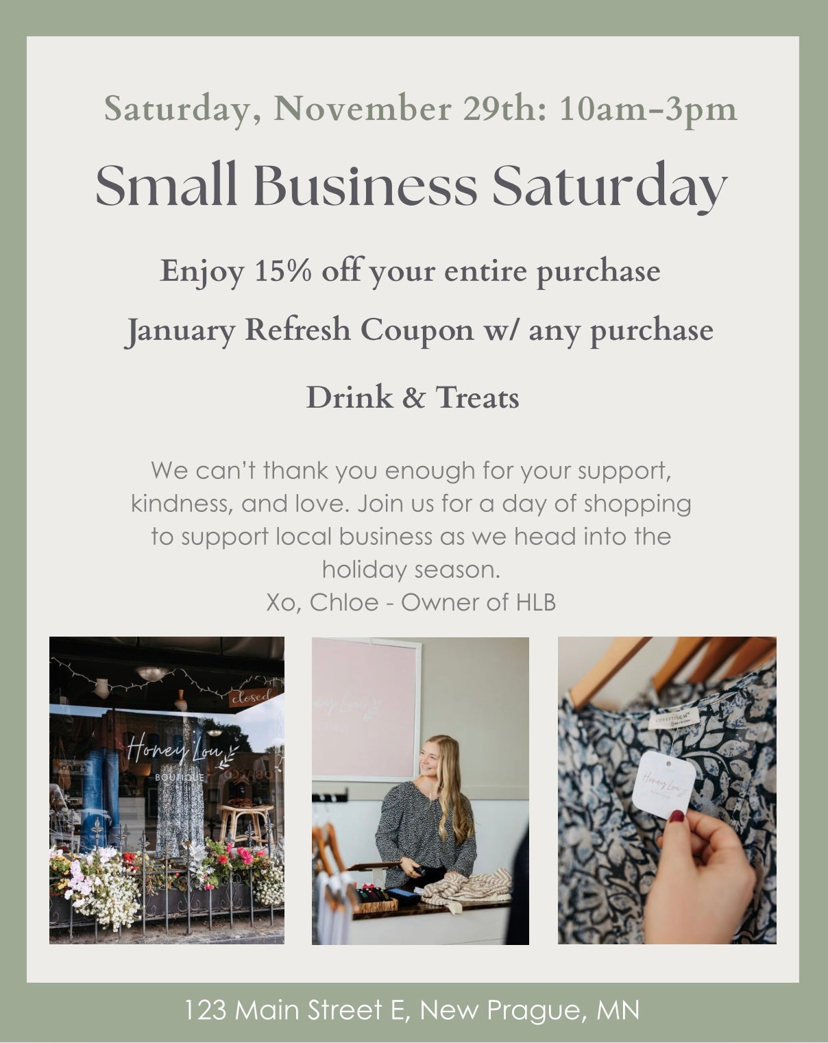 Join us Saturday, November 29th for a day of community, shopping & fun as we celebrate small businesses! Enjoy complimentary drinks & treats while you shop and take advantage of our special 15% off your purchase. Plus, at checkout, receive a January Refresh Card to get $10 off your purchase in January — perfect for starting the new year with style!