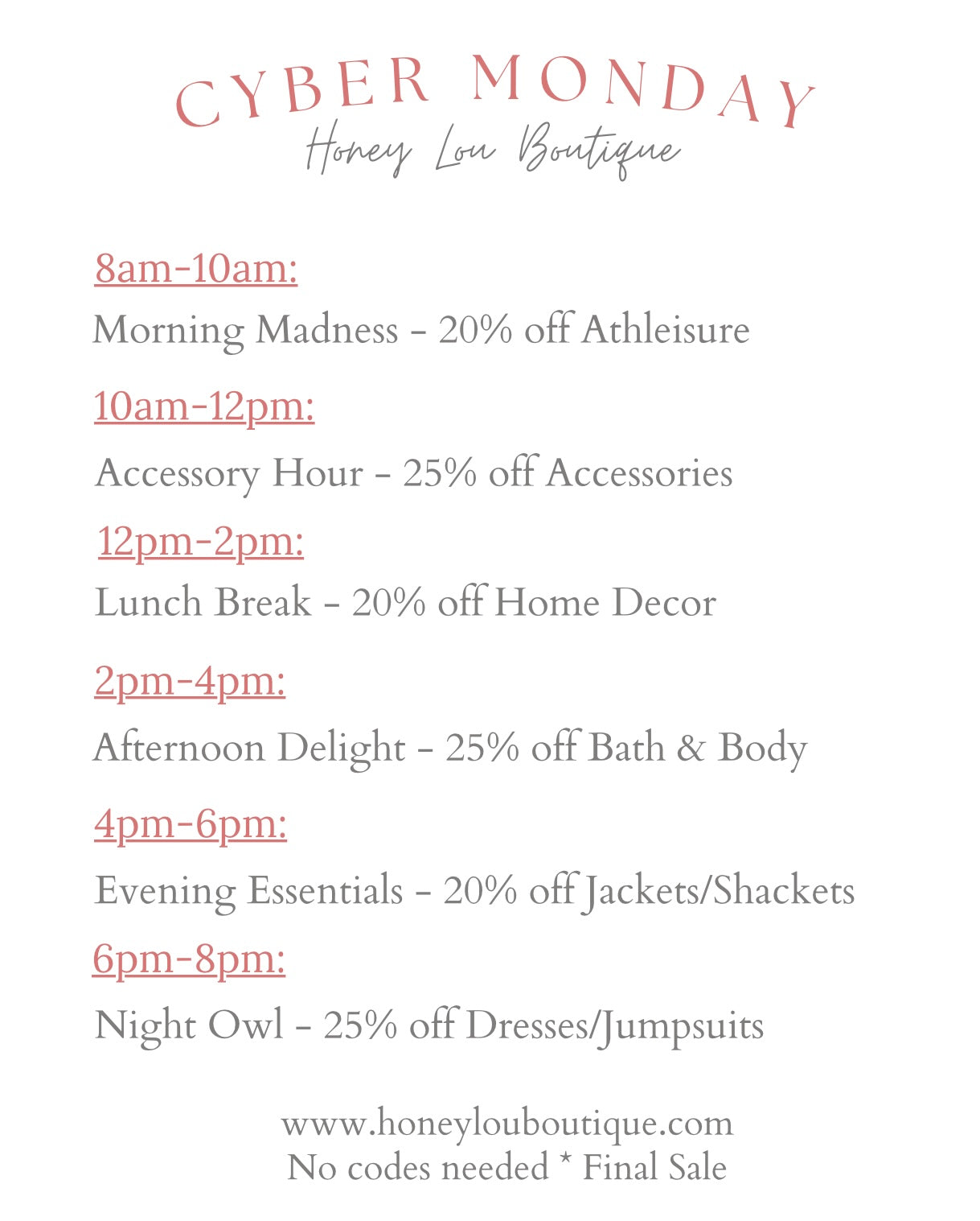 Check out our hourly deals for Cyber Monday! Available online 8am-8pm. No codes needed, all sales are final.