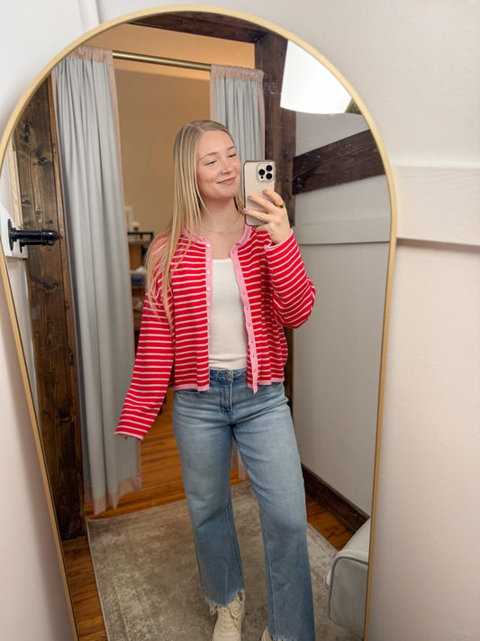 Button Front Striped Cardigan - Red/Pink