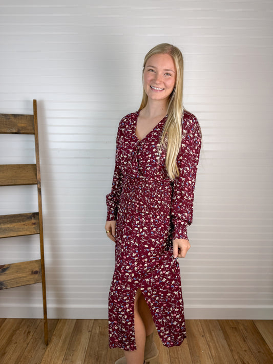 Floral Wrap Smocked Midi Dress - WineRegular price $59.95 USDRegular priceUnit price per-