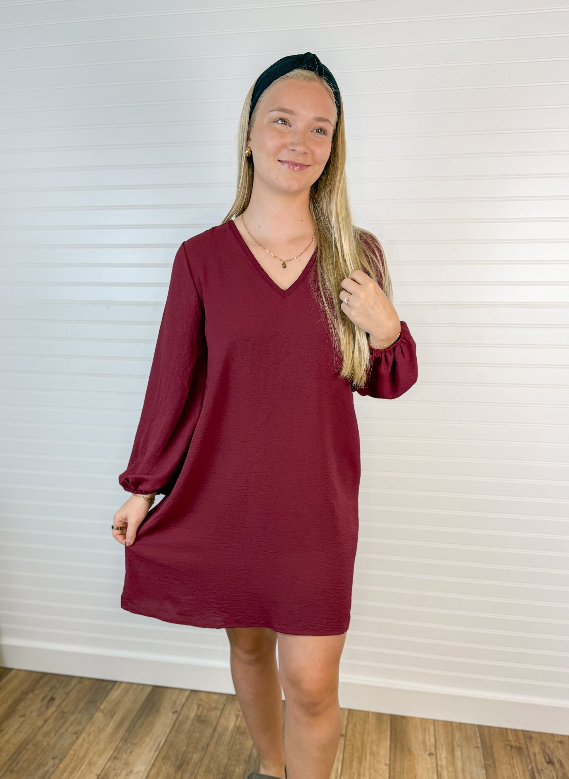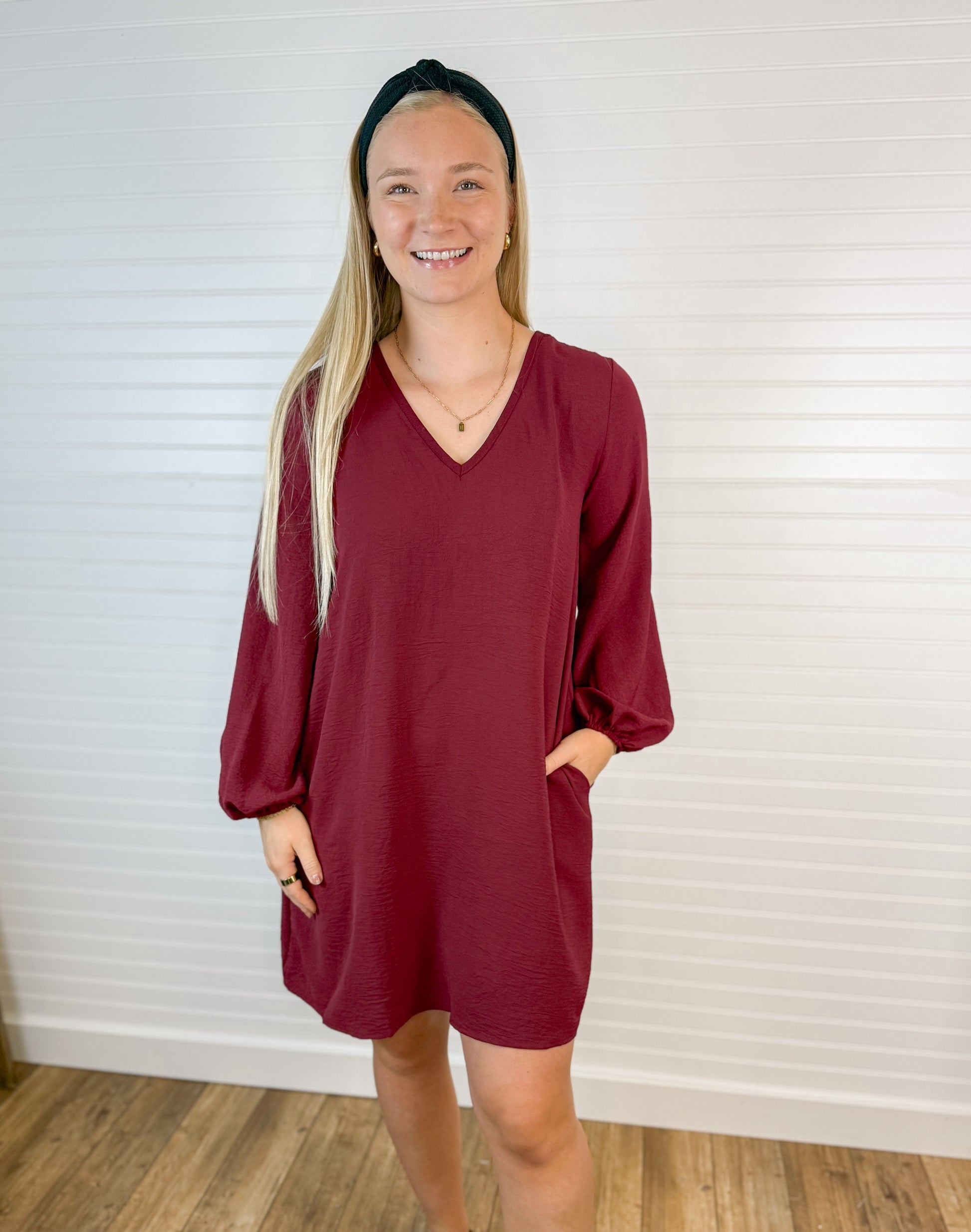 This Airflow V-Neck Long Sleeve Dress in Wine features breathable woven fabric designed for comfort. Its flattering V-neck and trendy balloon sleeves add a stylish touch, while the mini length keeps the look fresh and modern. Convenient side pockets provide practicality without sacrificing style. Perfect for everyday wear or special occasions.