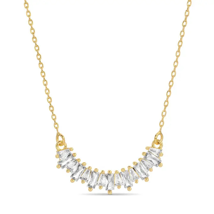 This elegant Baguette Curve Pendant Necklace is the perfect accessory to add a touch of sophistication to your vibe. 1W" x .5"H Pendant 16" Necklace 18K Gold or Rhodium Plated Brass Base Cubic Zirconia