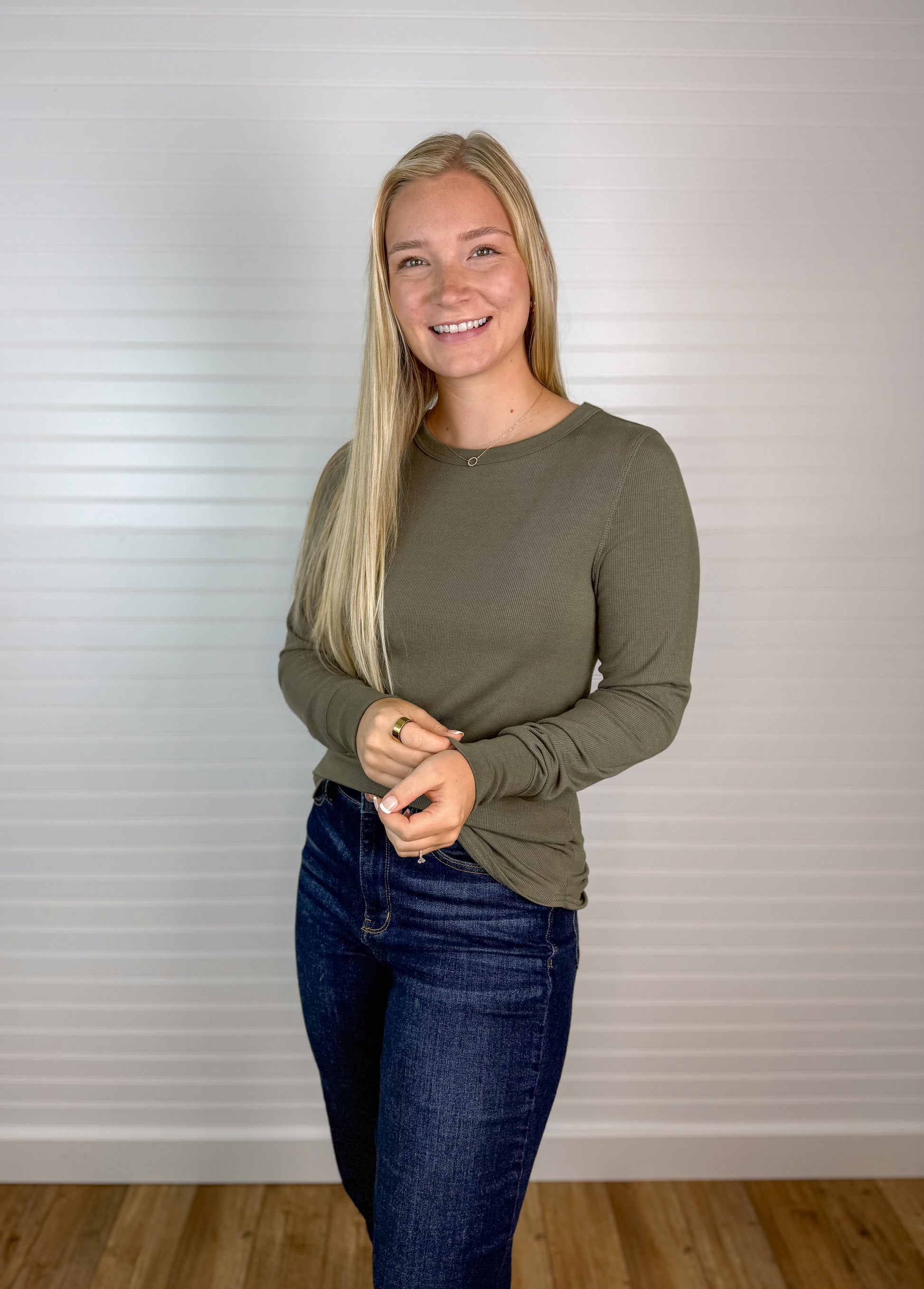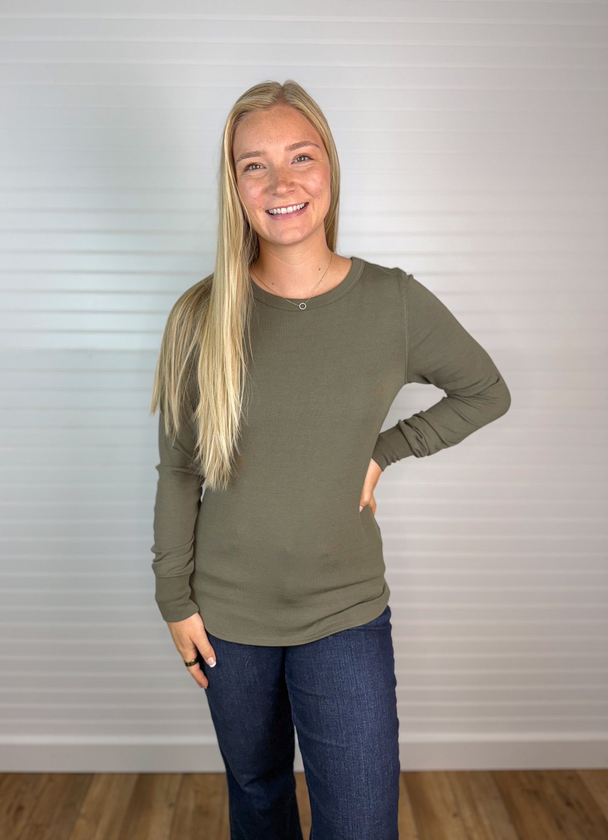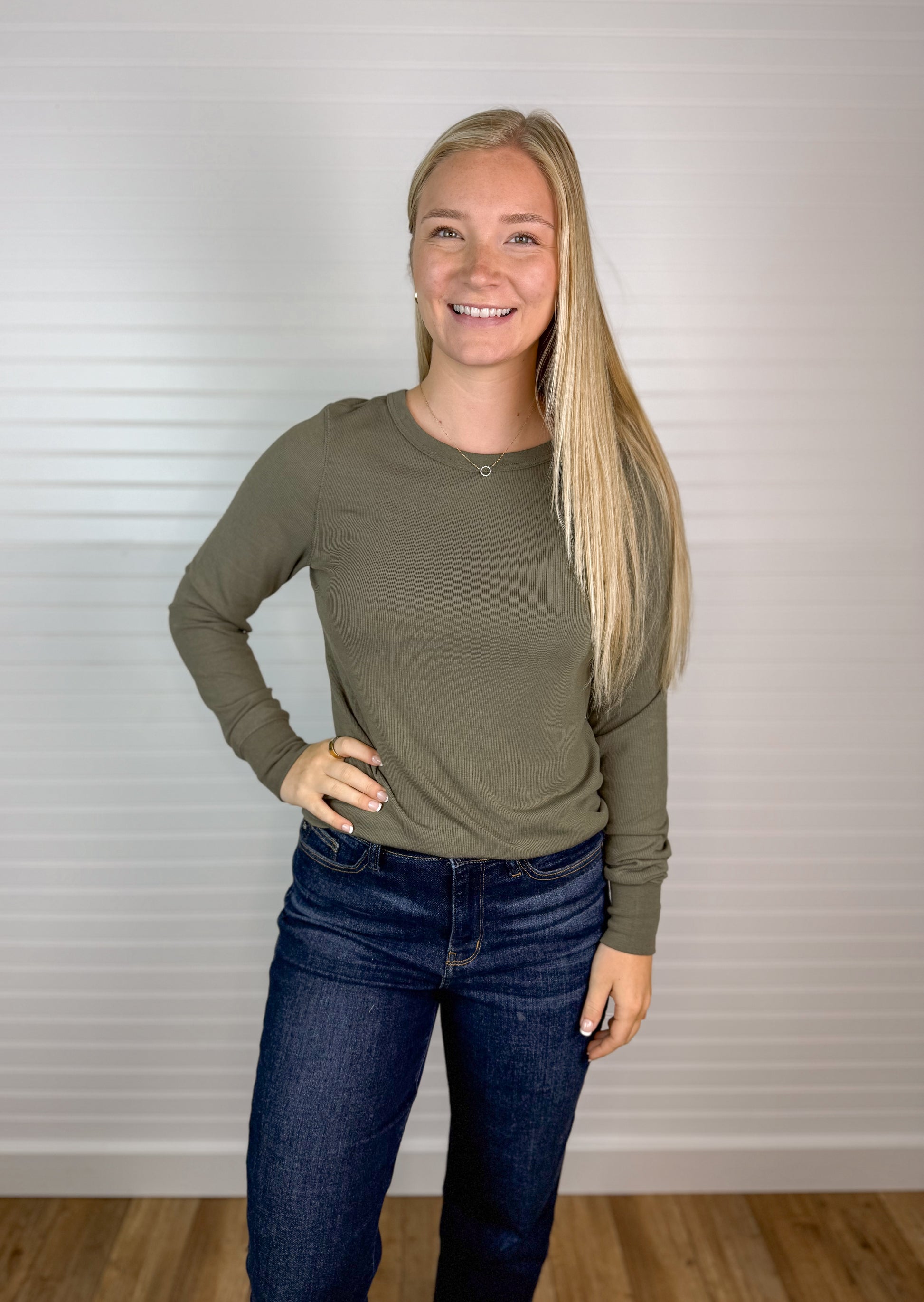 This Basic Ribbed Long Sleeve Top in Olive features a comfortable crewneck design and a soft, stretchy fabric blend of 95% rayon and 5% spandex. Its ribbed texture adds subtle detail, while the stretch allows for a snug fit—consider sizing down if you prefer a closer fit. Perfect for everyday wear, it combines comfort and style effortlessly.