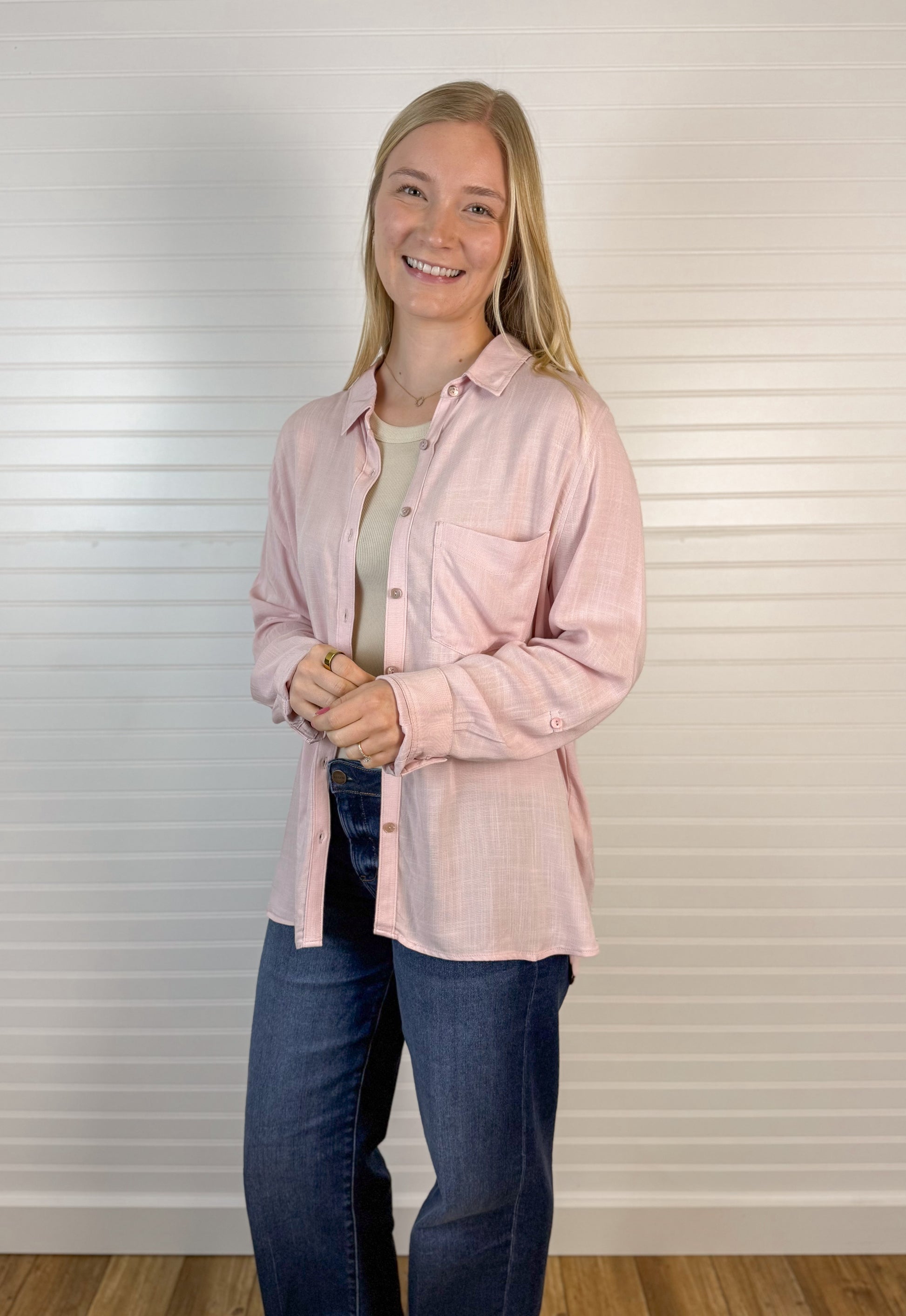 Effortless style meets practical design in this light pink button-down. Crafted from luxuriously soft 100% rayon, it features a classic long sleeve silhouette with functional rolled cuffs for versatile styling options. The tap sleeve detail adds subtle dimension, while shell buttons complete the polished look. Perfect for layering or wearing solo, this piece transitions seamlessly from casual to dressed-up occasions.
