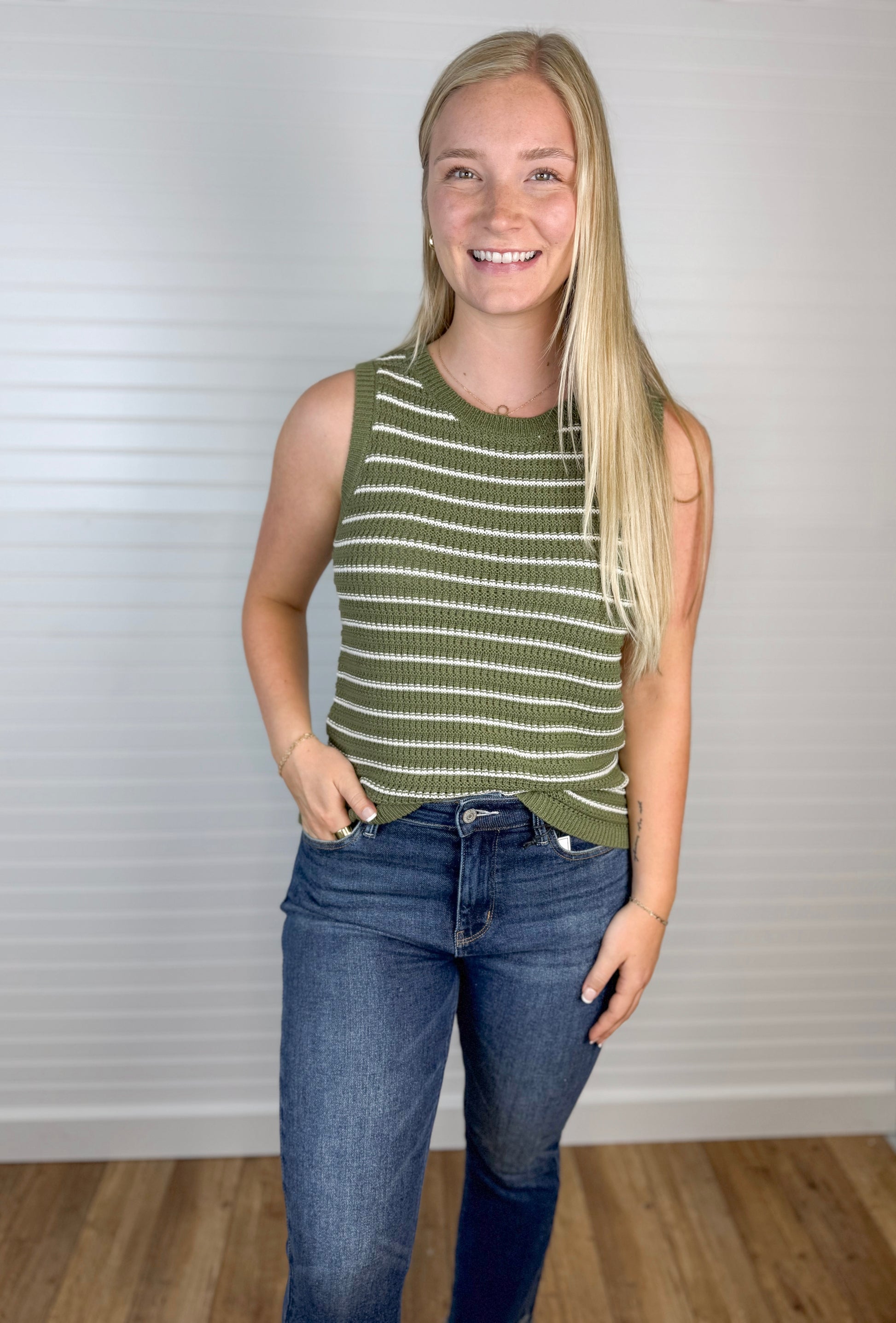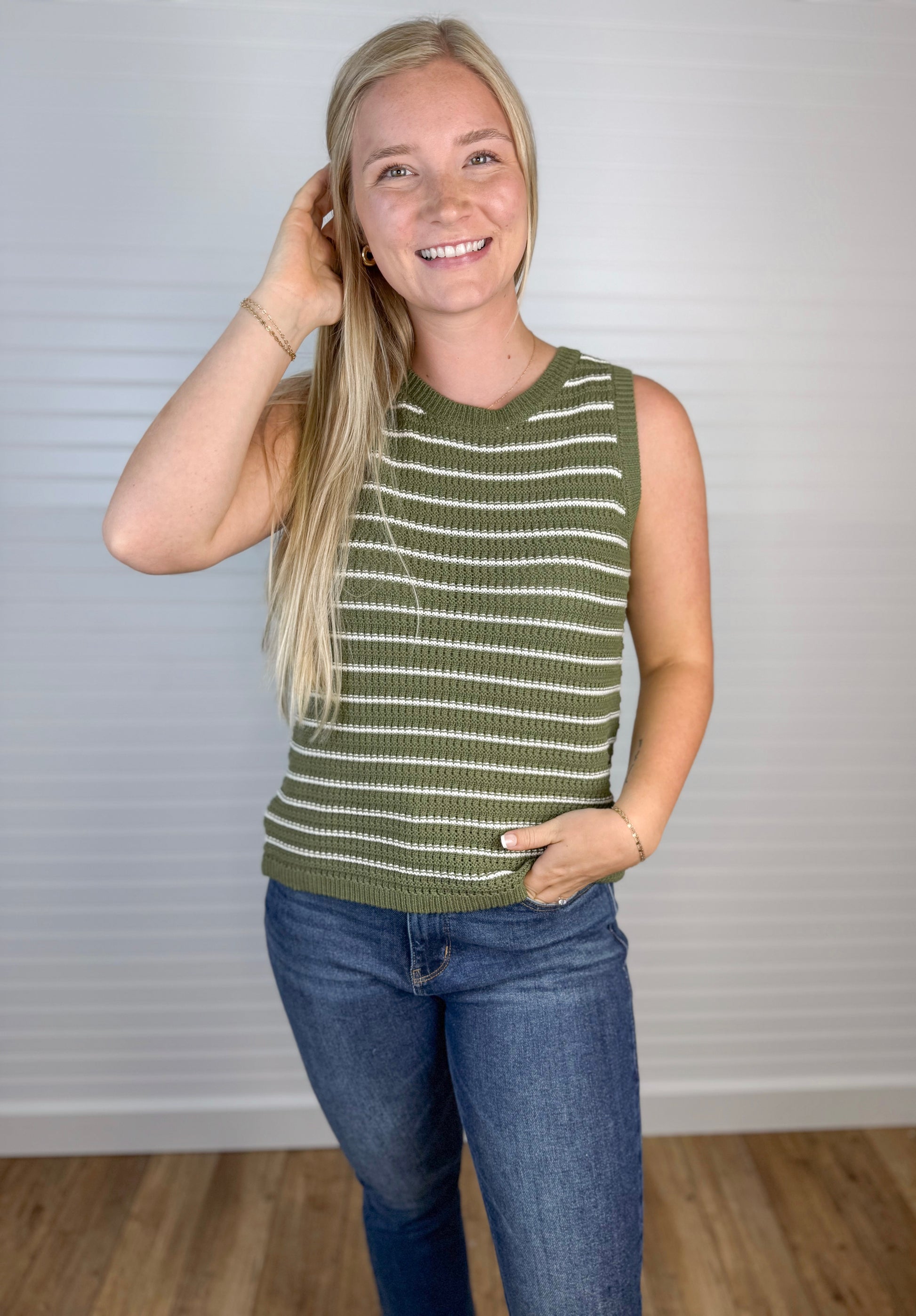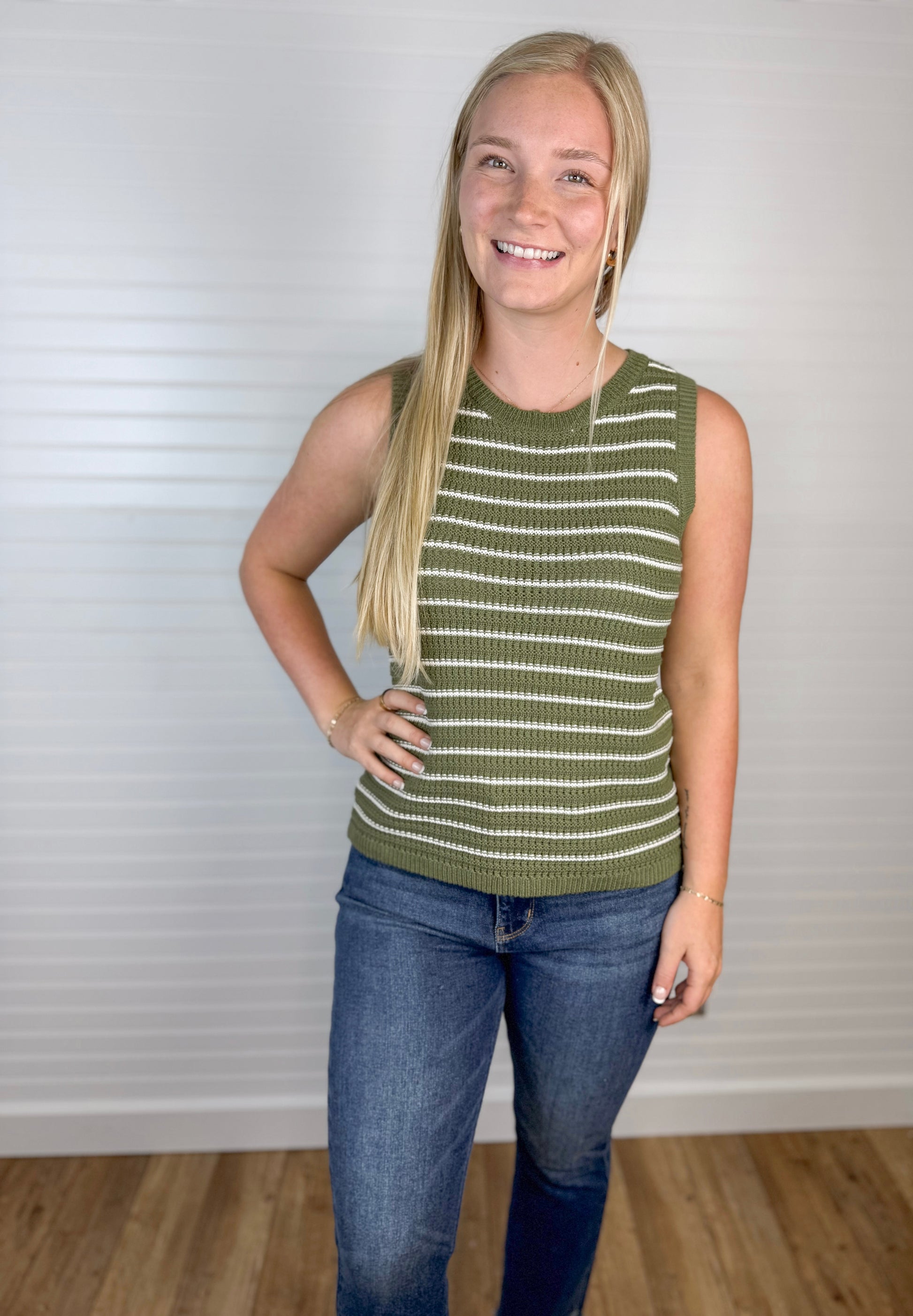 This sleeveless sweater tank features a round neck and is made from 100% cotton for comfort and breathability. Its chunky knit design includes ribbed detailing at the hem, neckline, and armholes, adding subtle texture. The striped pattern and olive color make it a versatile piece for layering or wearing on its own.