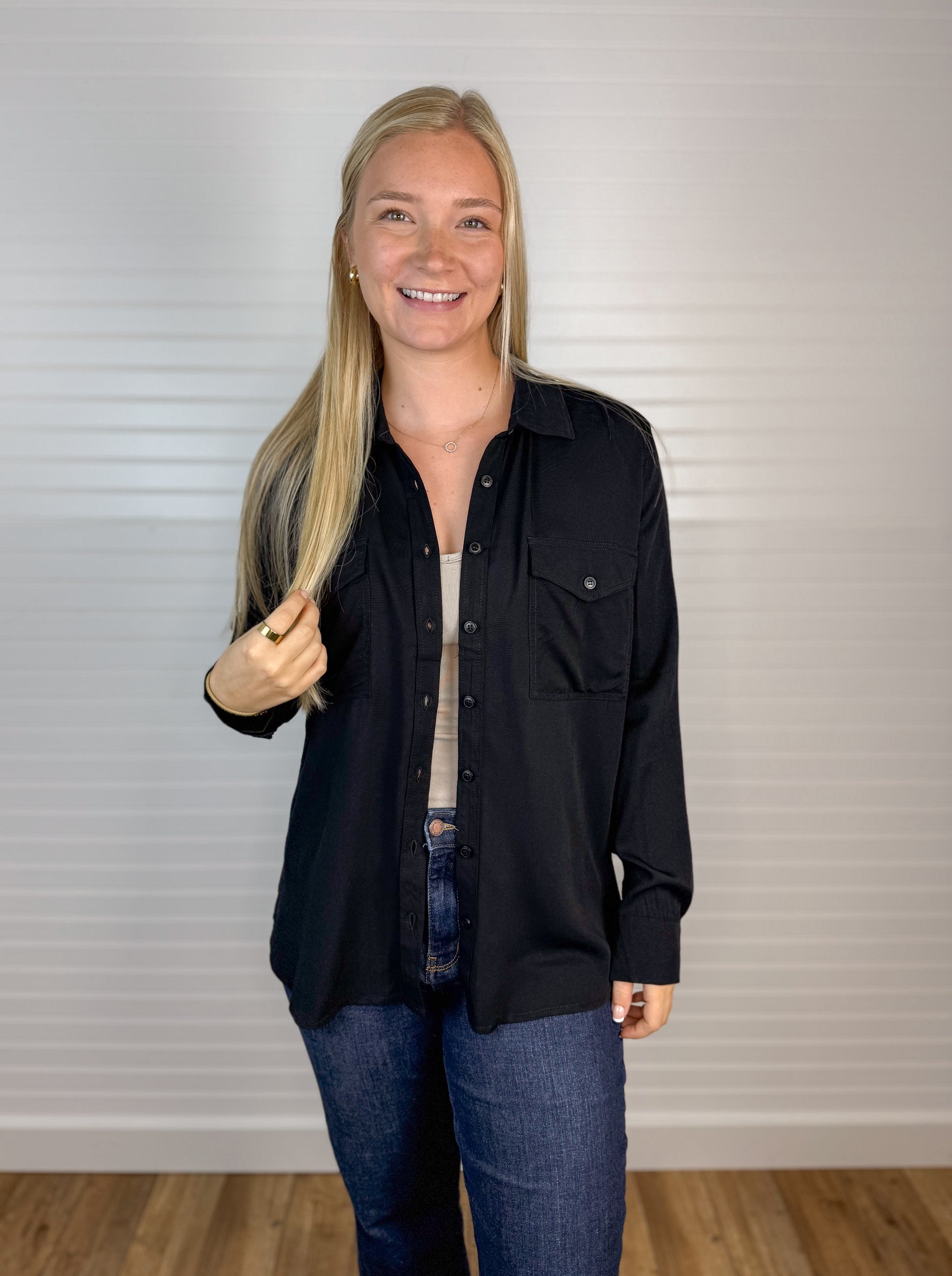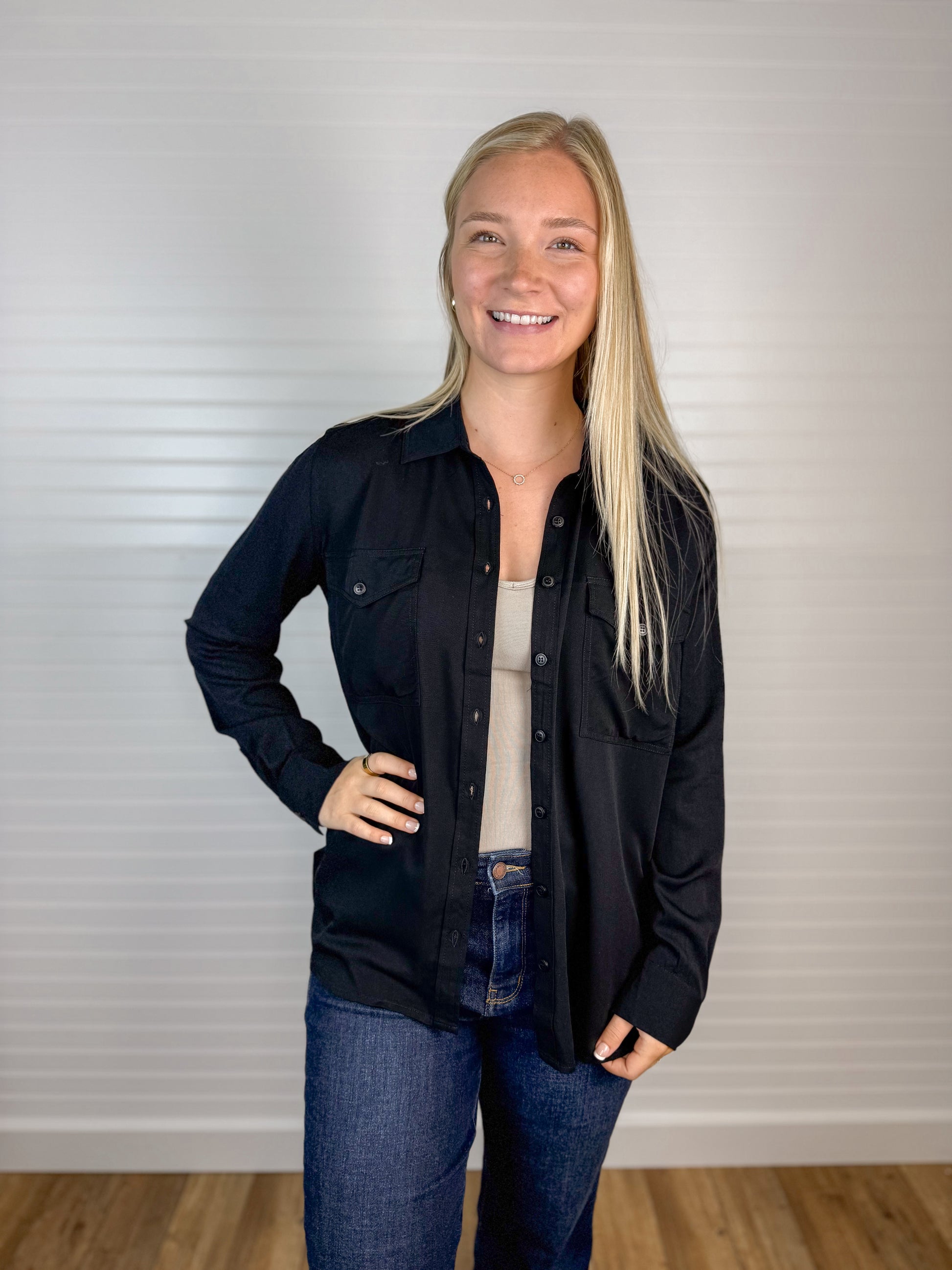 This classic black button-down shirt features long sleeves, a collared neckline, and front chest pockets with flaps for added detail. Its rounded bottom and side slits make it easy to layer and wear every day. A simple, versatile piece perfect for any wardrobe.