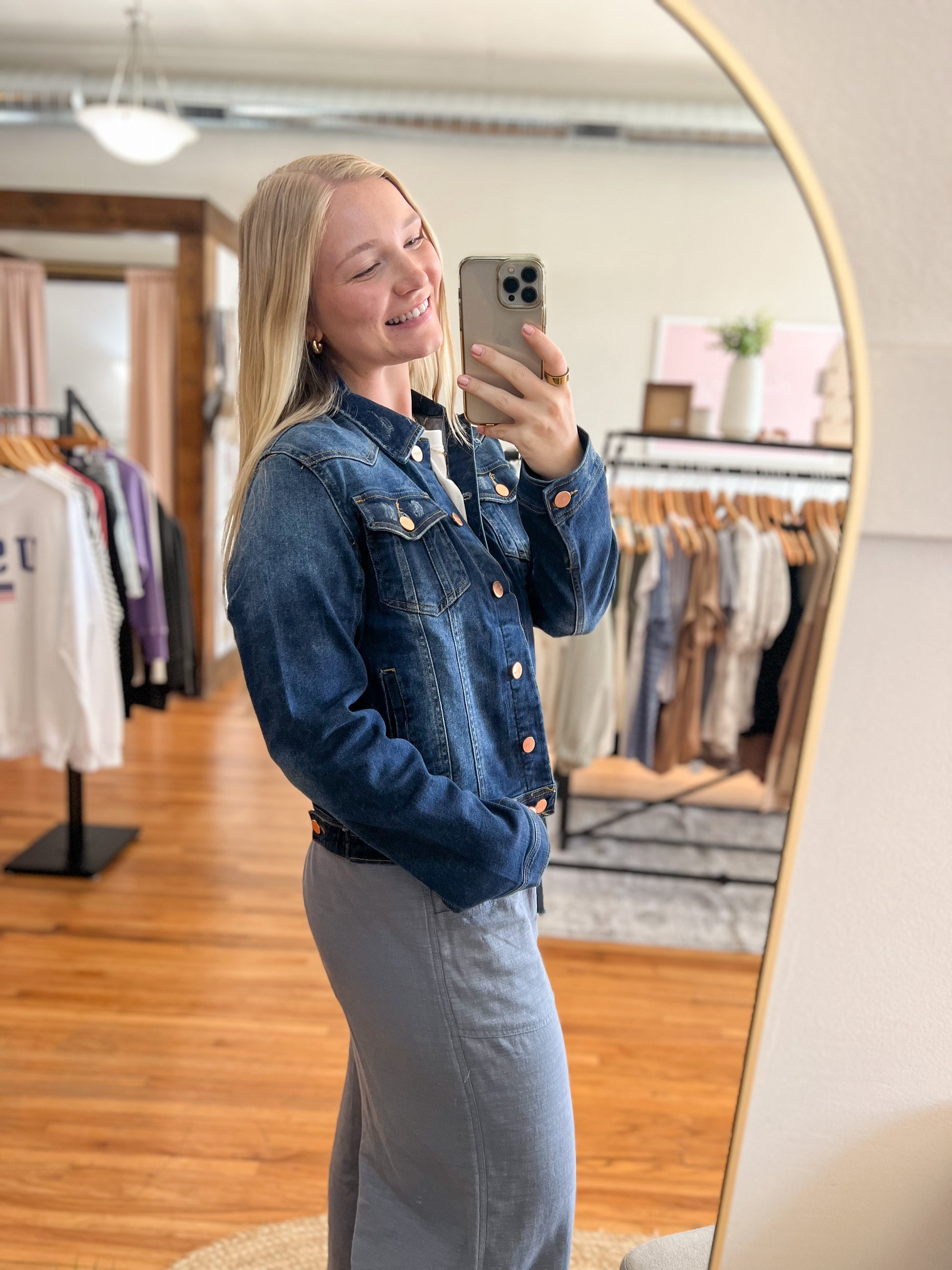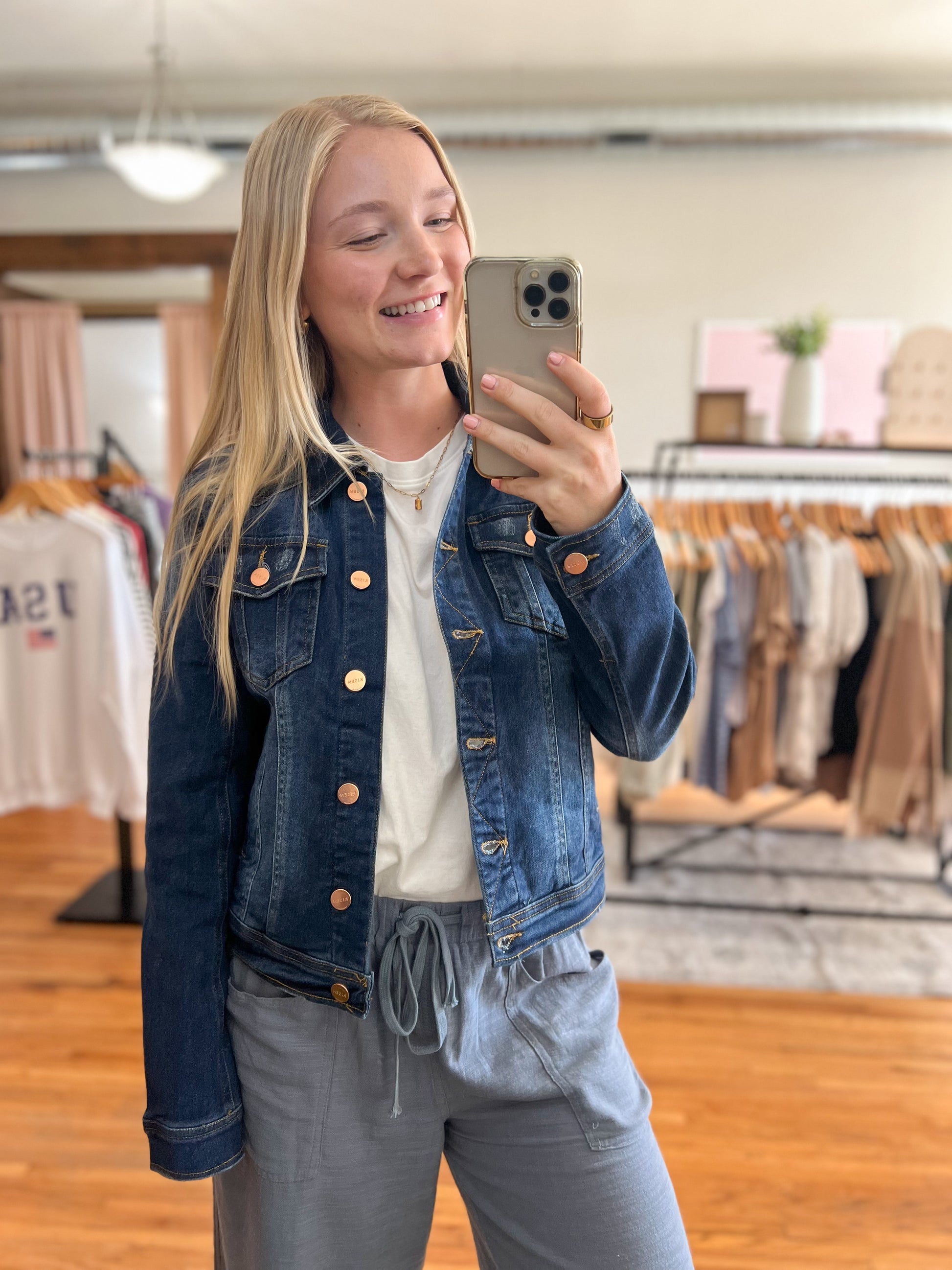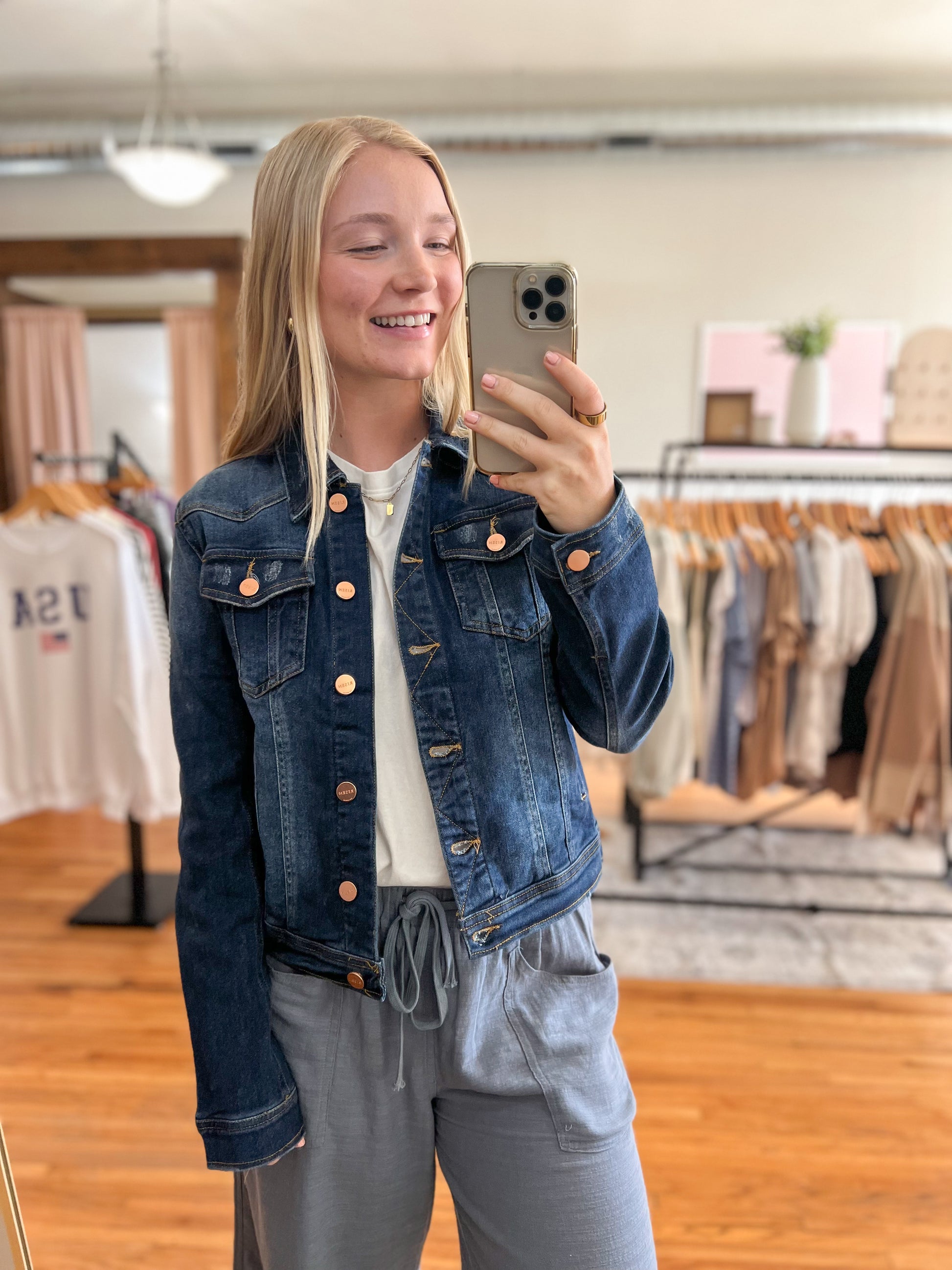 This Classic Denim Jacket in dark wash offers a timeless look with a comfortable fit. Made from 93% cotton, 6% polyester, and 1% spandex, it provides durability with a slight stretch for ease of movement. With a length of 20.5" and a chest measurement of 37" in size S, it’s perfect for layering over your favorite outfits.
