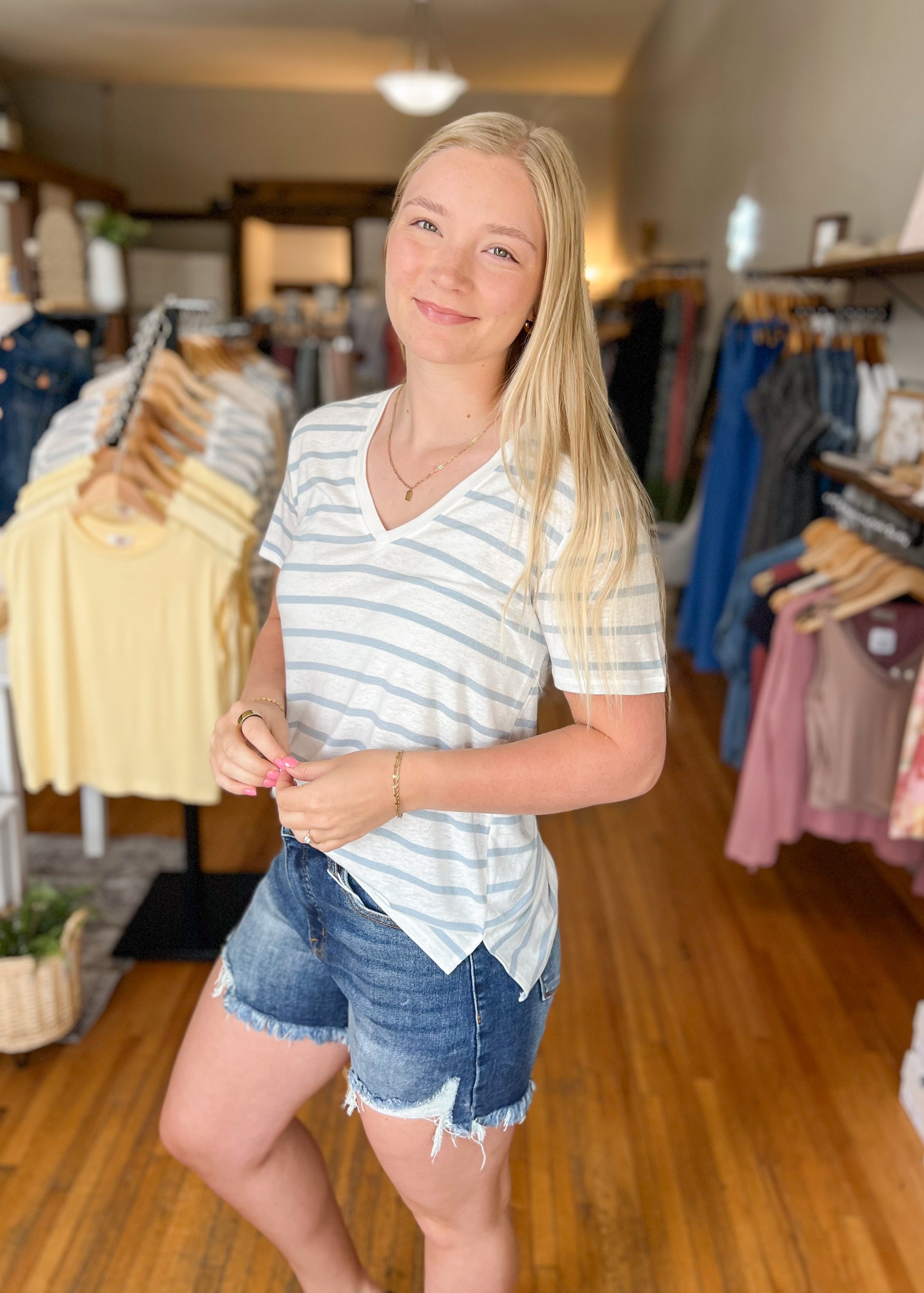 This short-sleeve V-neck tee features classic stripes with a subtle accent color at the neckline. Made from a soft cotton, linen, and rayon blend, it offers a relaxed and comfortable fit perfect for everyday wear. Its breathable fabric keeps you comfortable all day long.