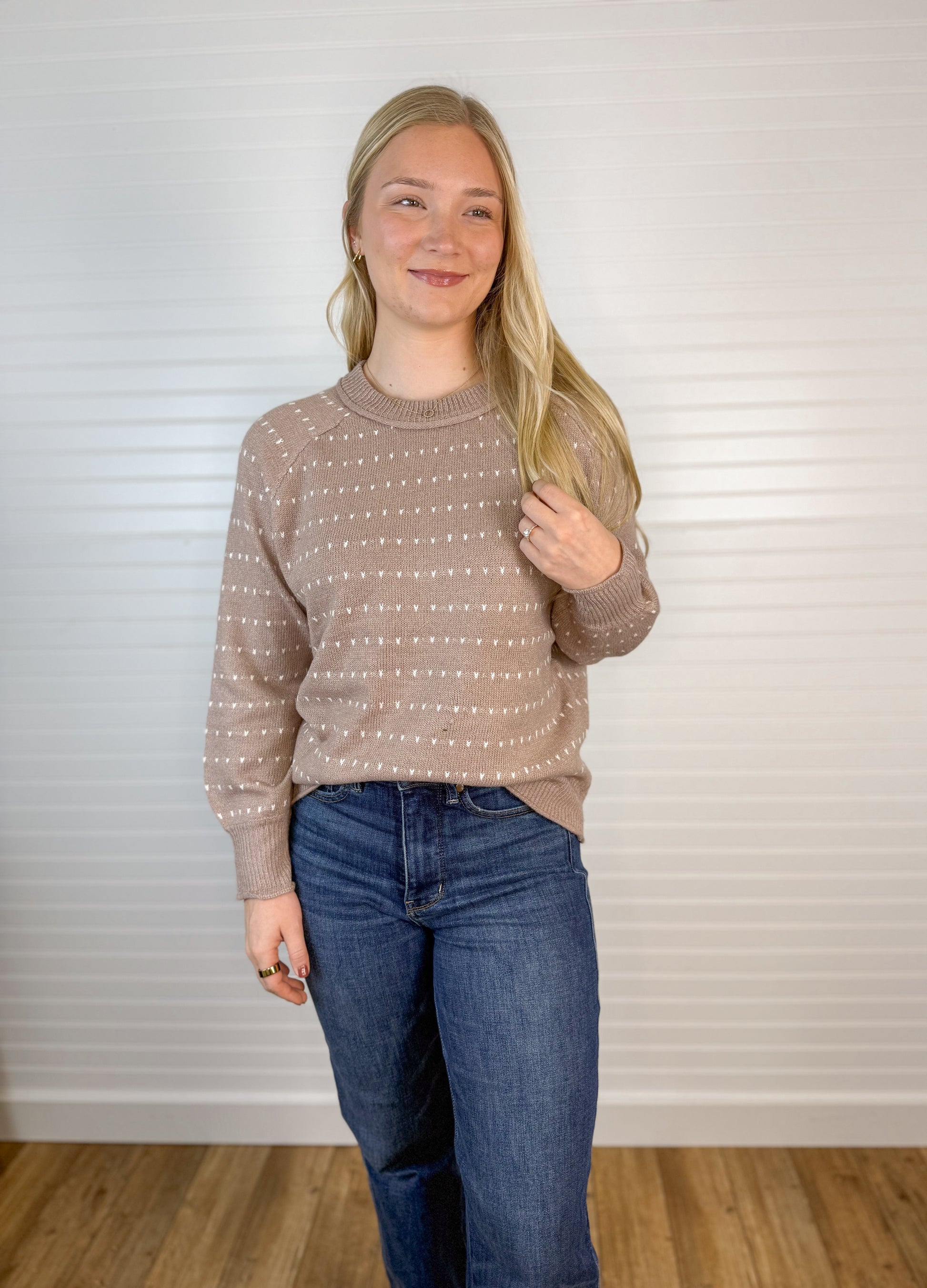 Cozy up in this dotted striped pullover sweater featuring a classic crew neck and long sleeves. The taupe colorway pairs effortlessly with your everyday wardrobe, while the textured stripe pattern adds subtle visual interest.