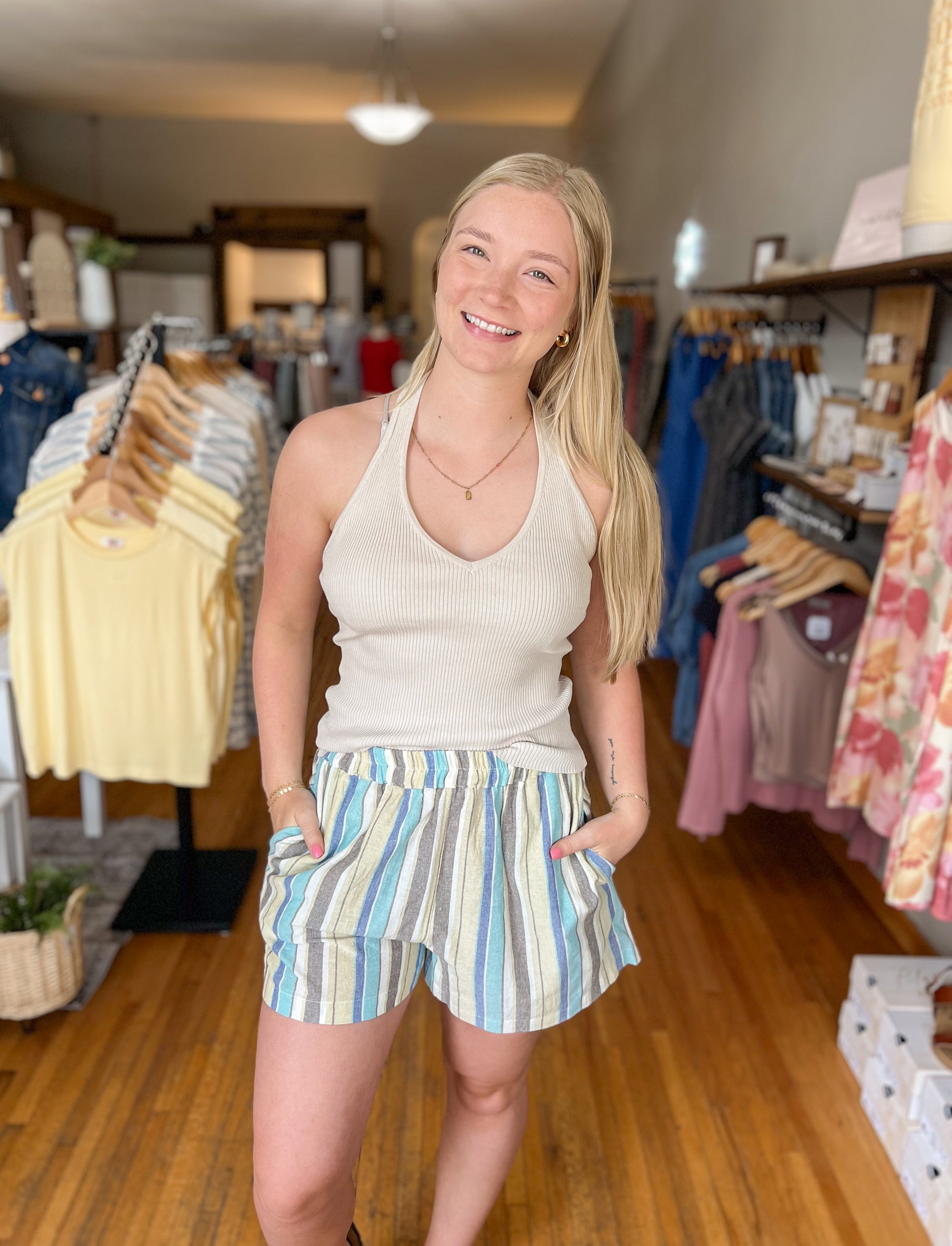 Light and breezy, these Florina multicolor striped shorts offer a relaxed fit with an elastic waistband for comfortable wear all day. Made from 100% cotton, they are perfect for sunny days and easily paired with a simple tee or flowy blouse for a casual, boho-inspired style.