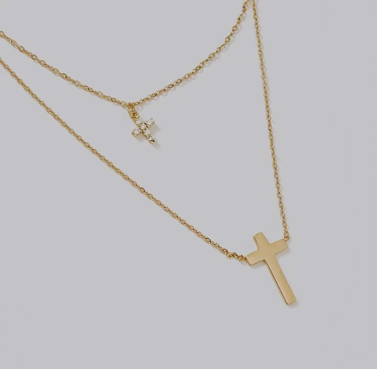 Turn heads with this Faithfully Layered Cross Necklace. This bold gold layered necklace features a solid gold cross and a dainty diamond cross for an eye-catching, chic look that's sure to earn compliments. Strut confidently knowing you look your divine best!
