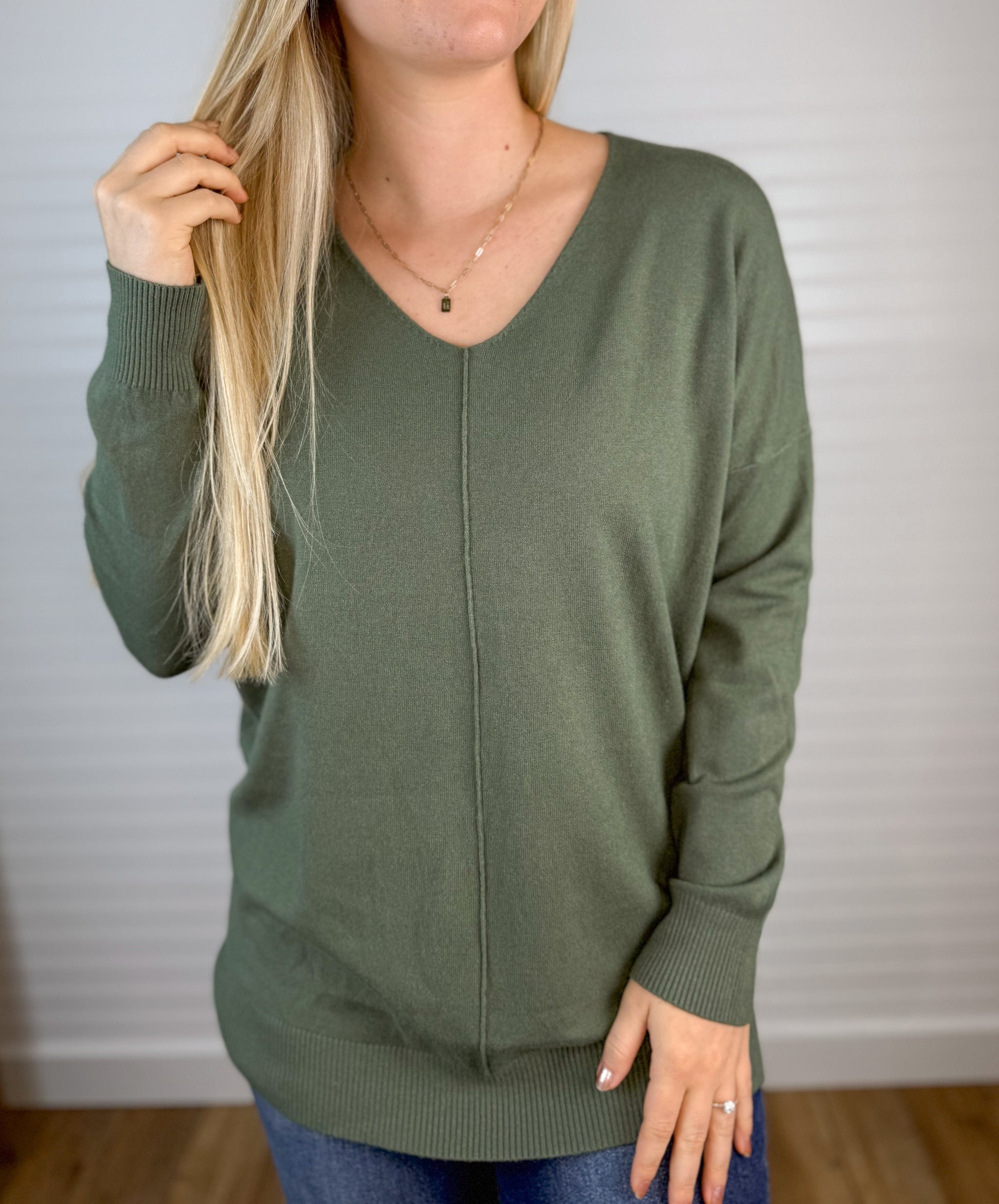 This long V-neck sweater features a stylish front seam detail that adds subtle texture and visual interest. Available in four versatile colors, it offers a comfortable fit perfect for layering or wearing on its own. Its simple design makes it an easy choice for everyday wear.