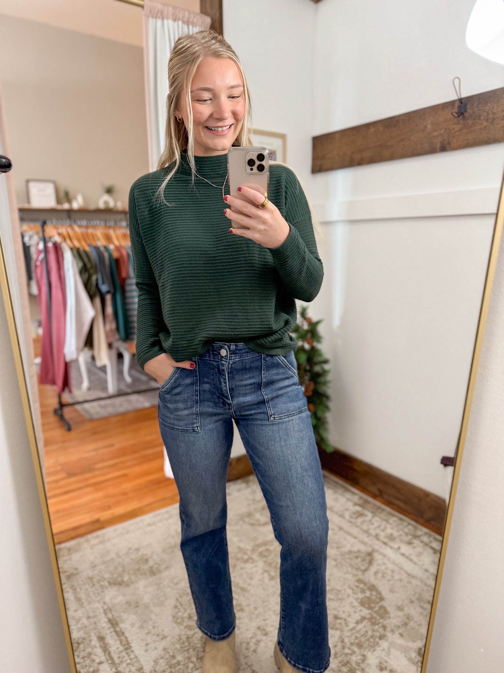 High Rise Ankle Flare Patch Pocket Denim Elevate your denim collection with these high-rise ankle flares. Featuring a comfortable 10 1/2" rise and a 28" inseam, they're designed for a flattering fit that hits right at the ankle.