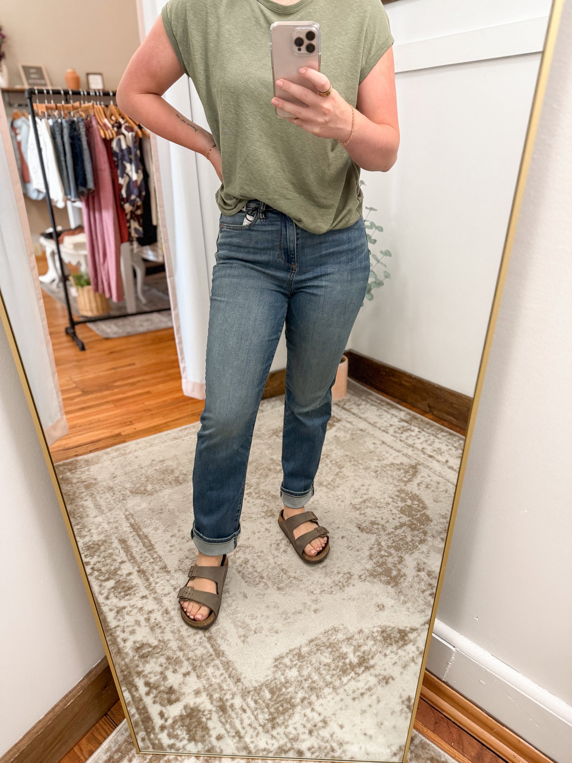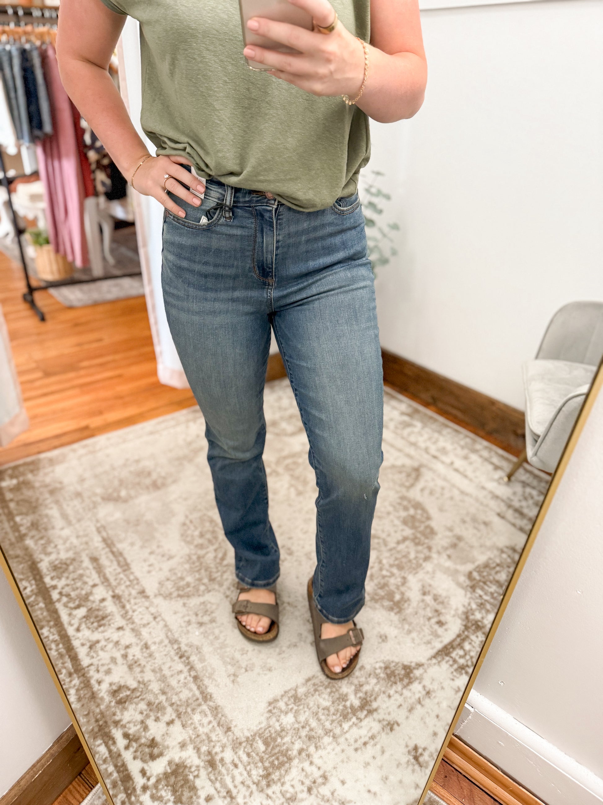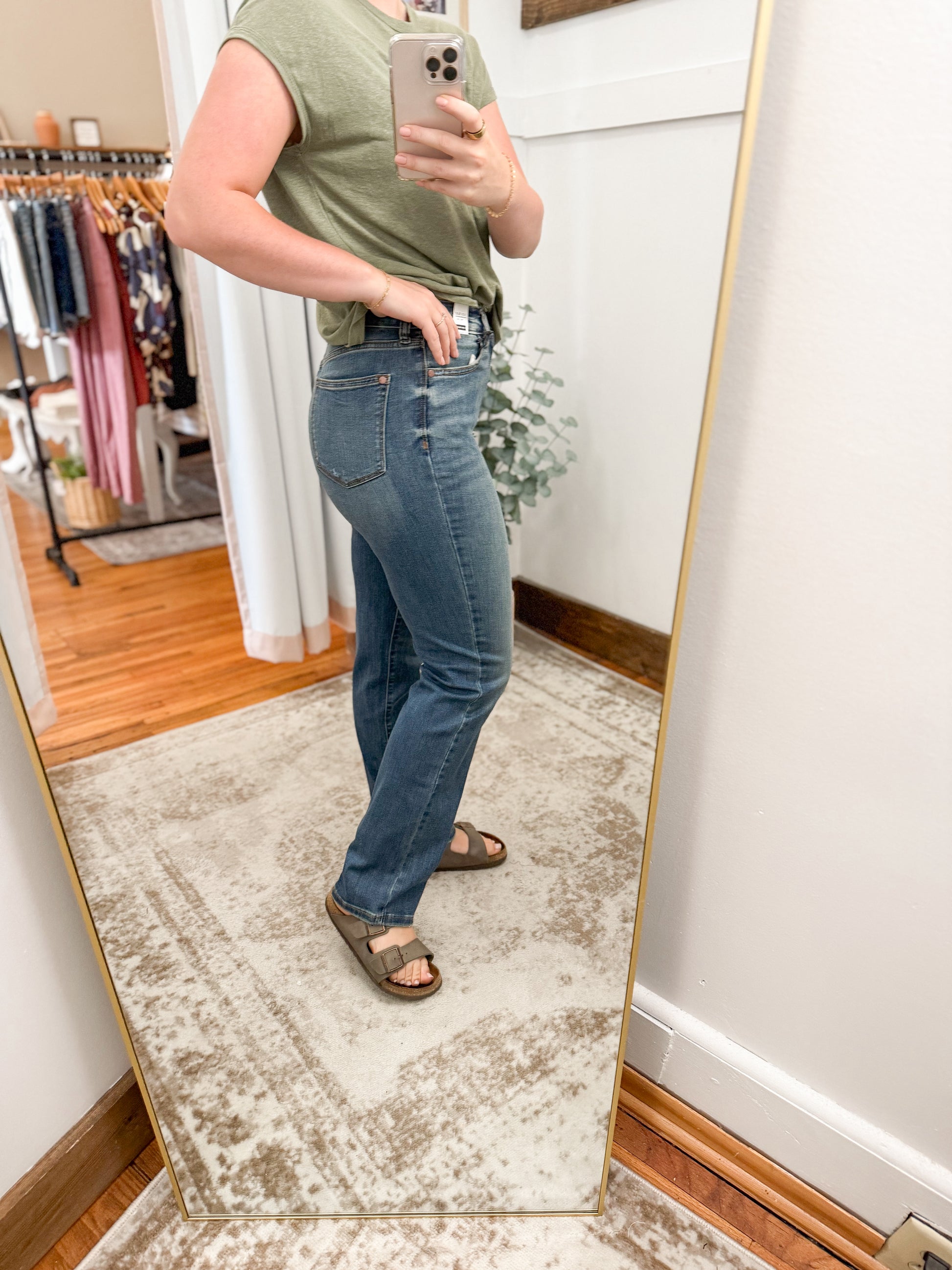 These dark high waist straight leg denim jeans offer a comfortable fit with a blend of 67% cotton, 20% rayon, 13% polyester, and 2% spandex. Featuring an 11-inch front rise and a 30-inch inseam, they provide a flattering silhouette and versatile style for everyday wear.