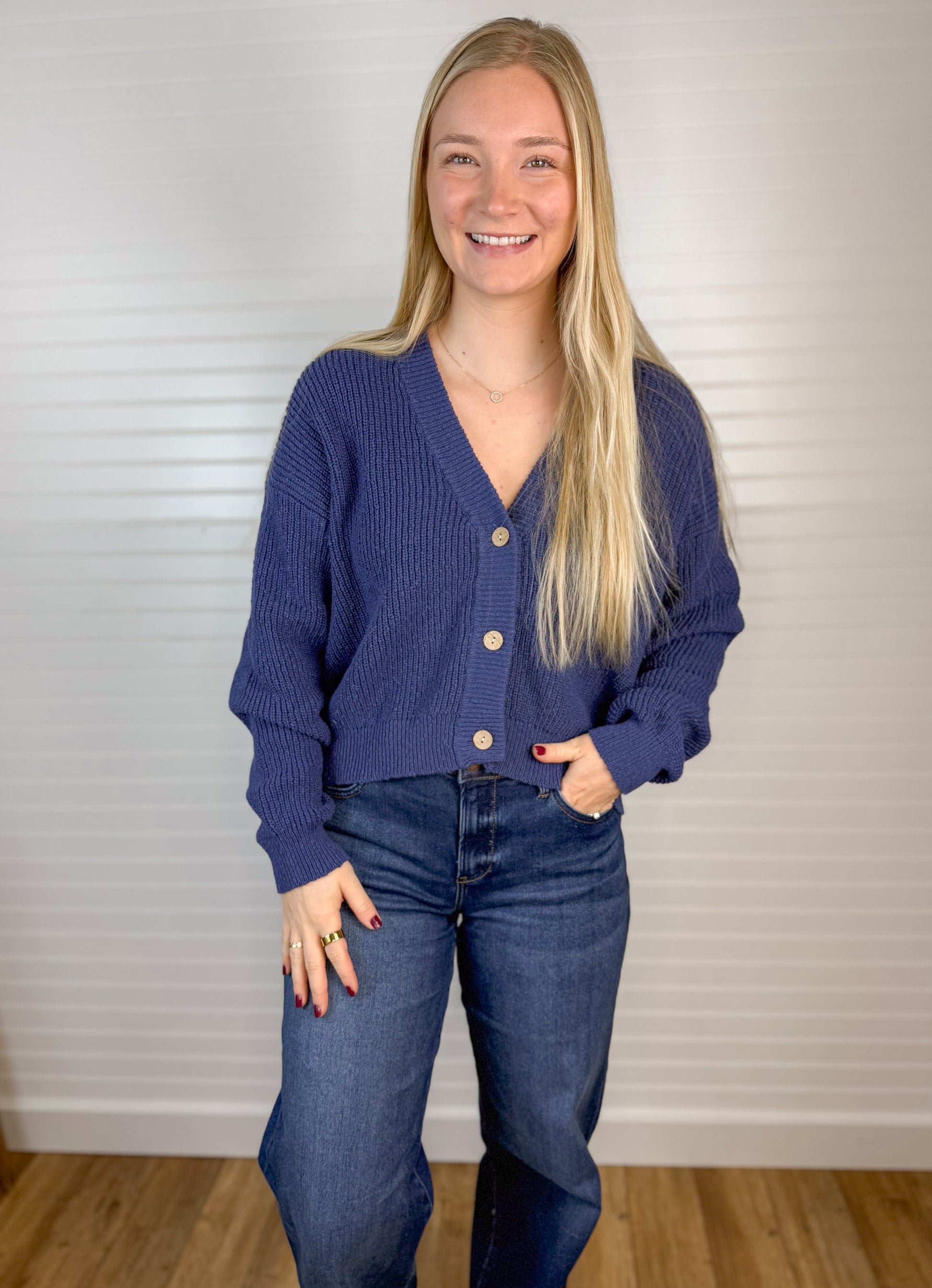 Effortless layering meets everyday comfort in this classic cotton cardigan. Crafted from soft knit fabric, it features a timeless v-neck design and long sleeves with button-down closure for easy styling.