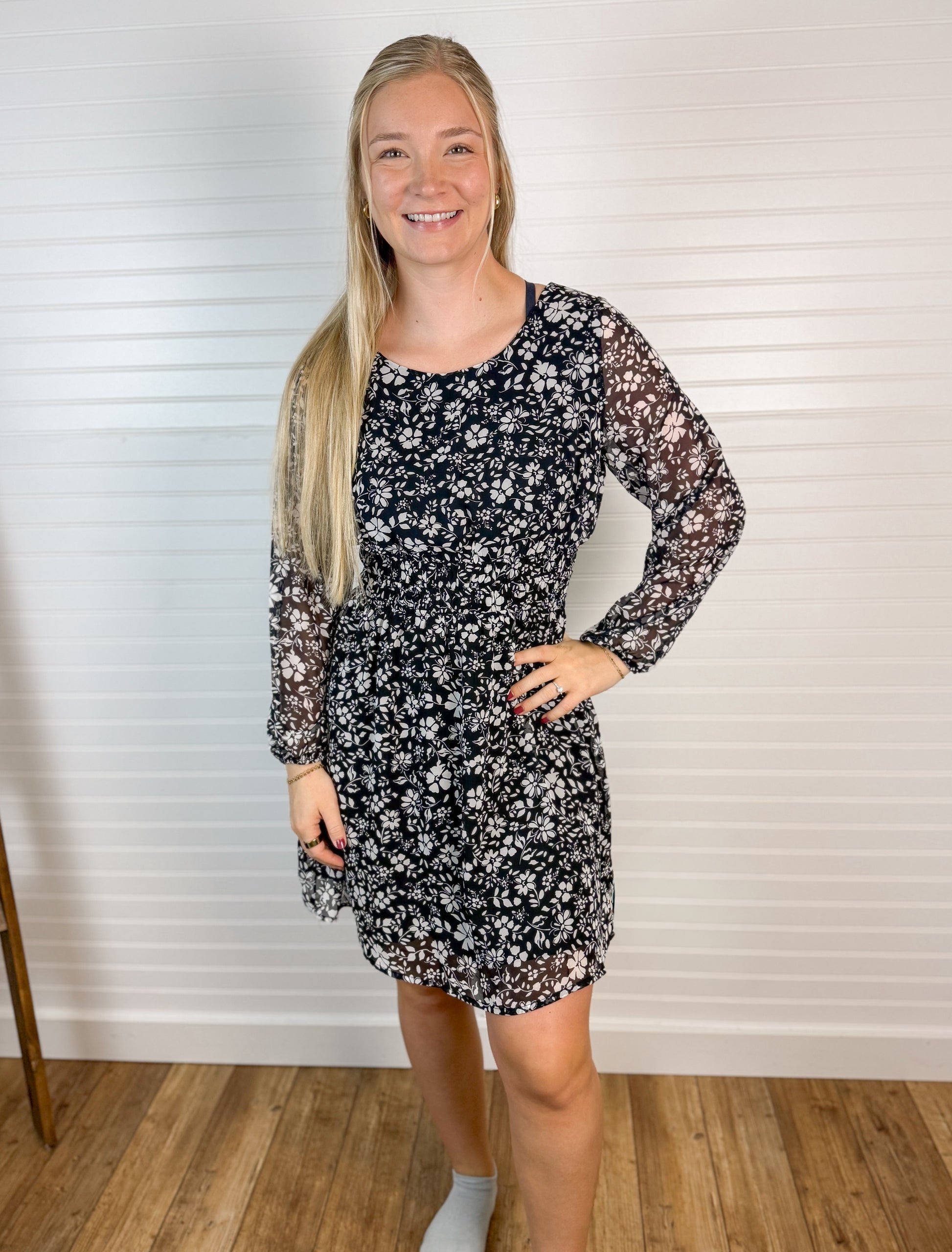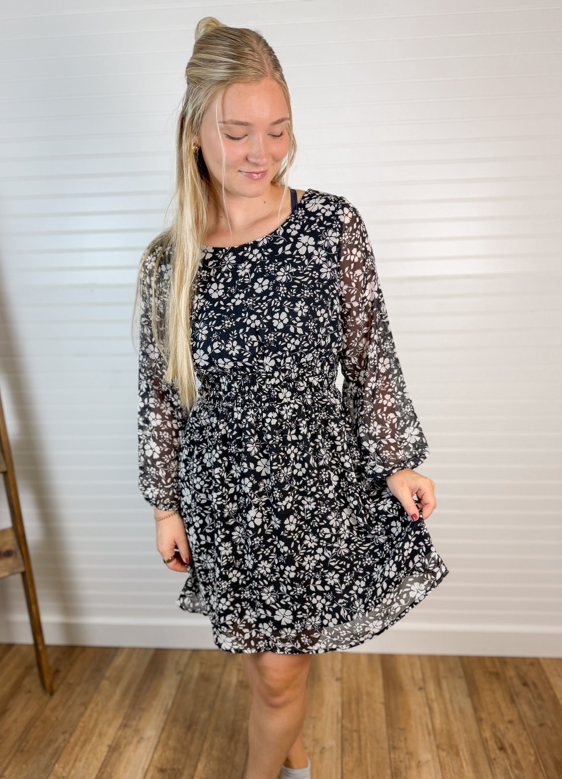 This long sleeve floral mini dress features a round neck and a timeless black and ivory pattern. Its lightweight fabric offers comfort and ease of movement, making it perfect for everyday wear or special occasions. The flattering mini length pairs well with boots or heels for a versatile look.