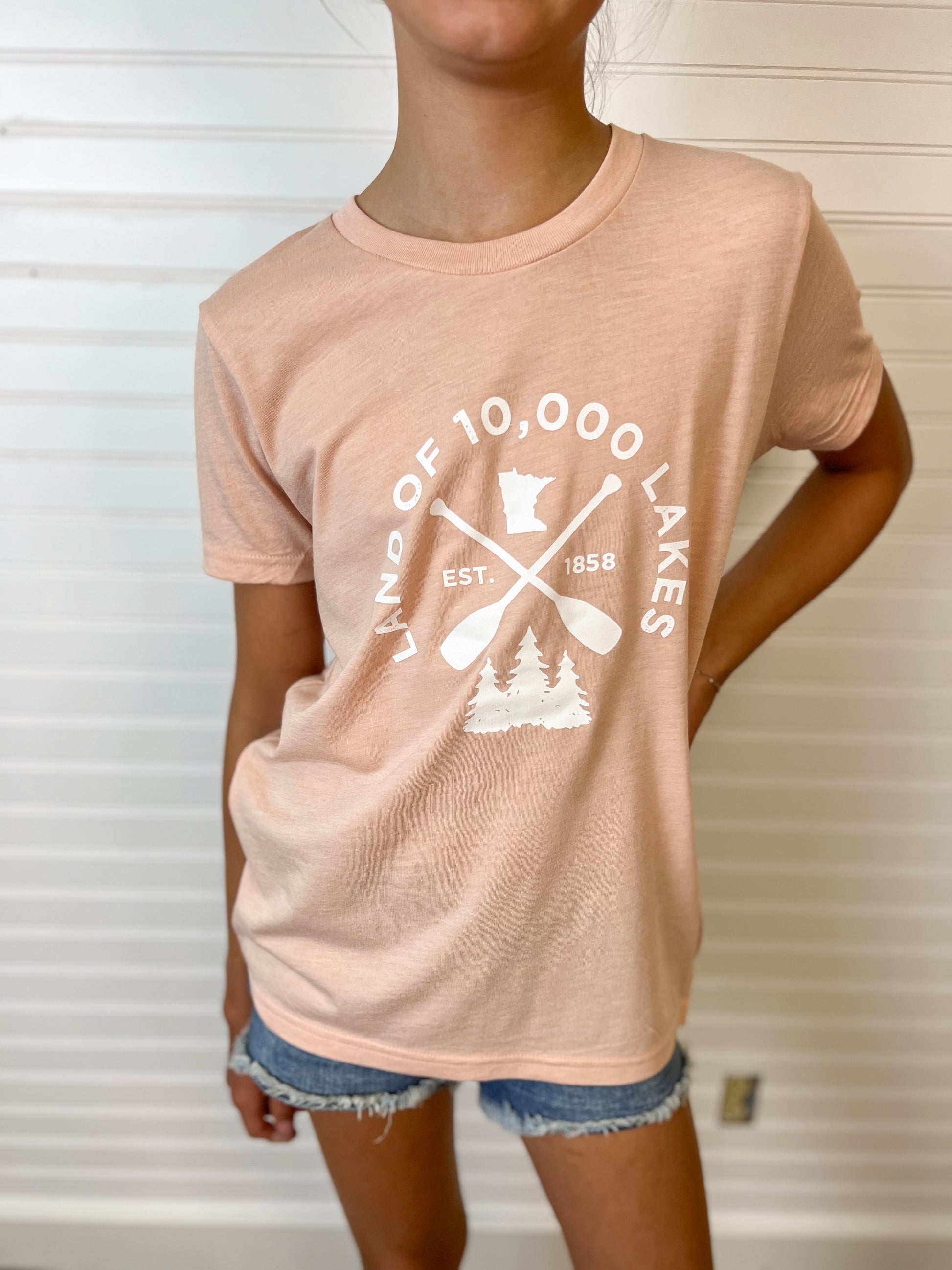 A youth tee in heather peach. Features our Minnesota Land of 10,000 Lakes design.