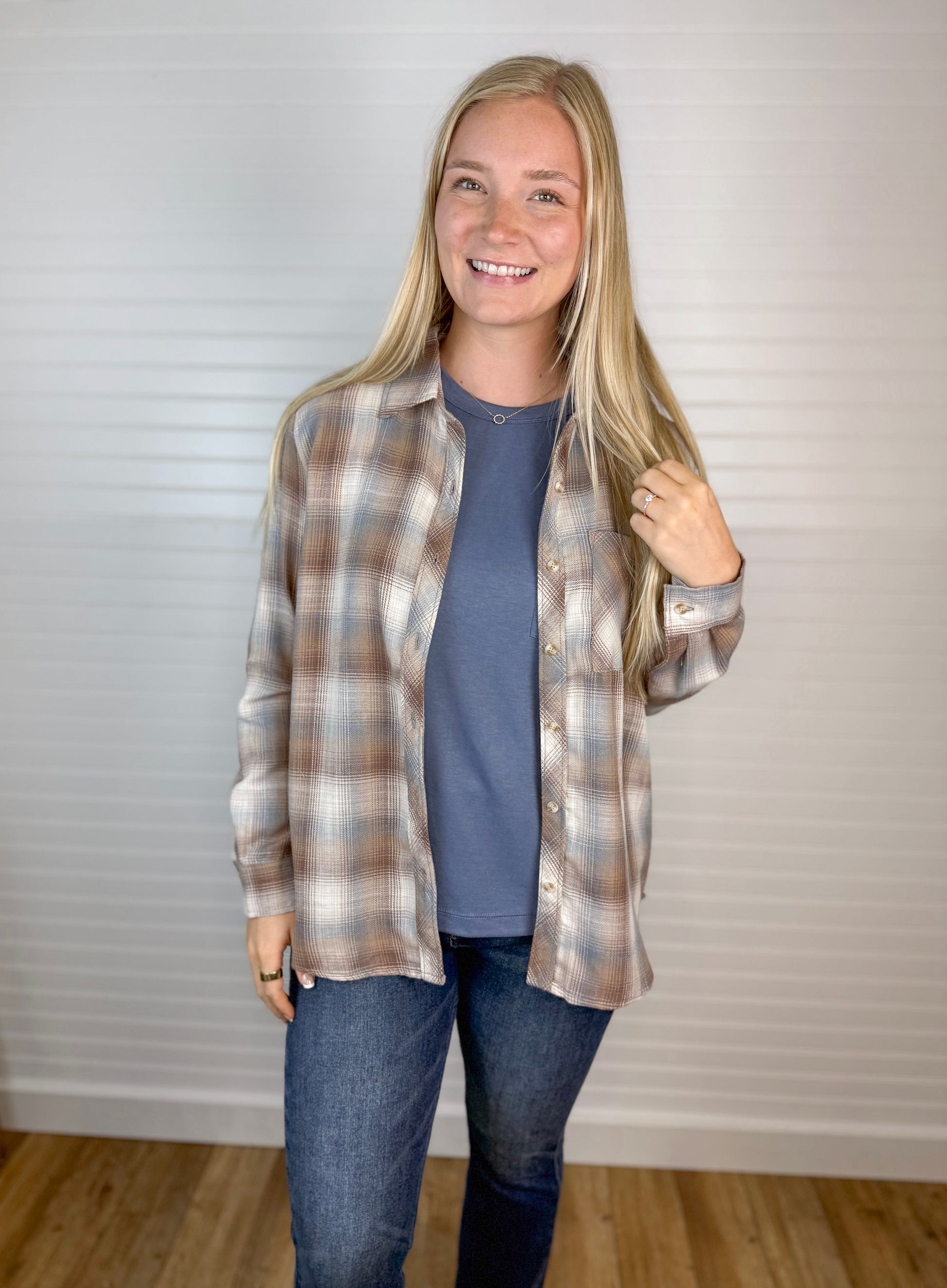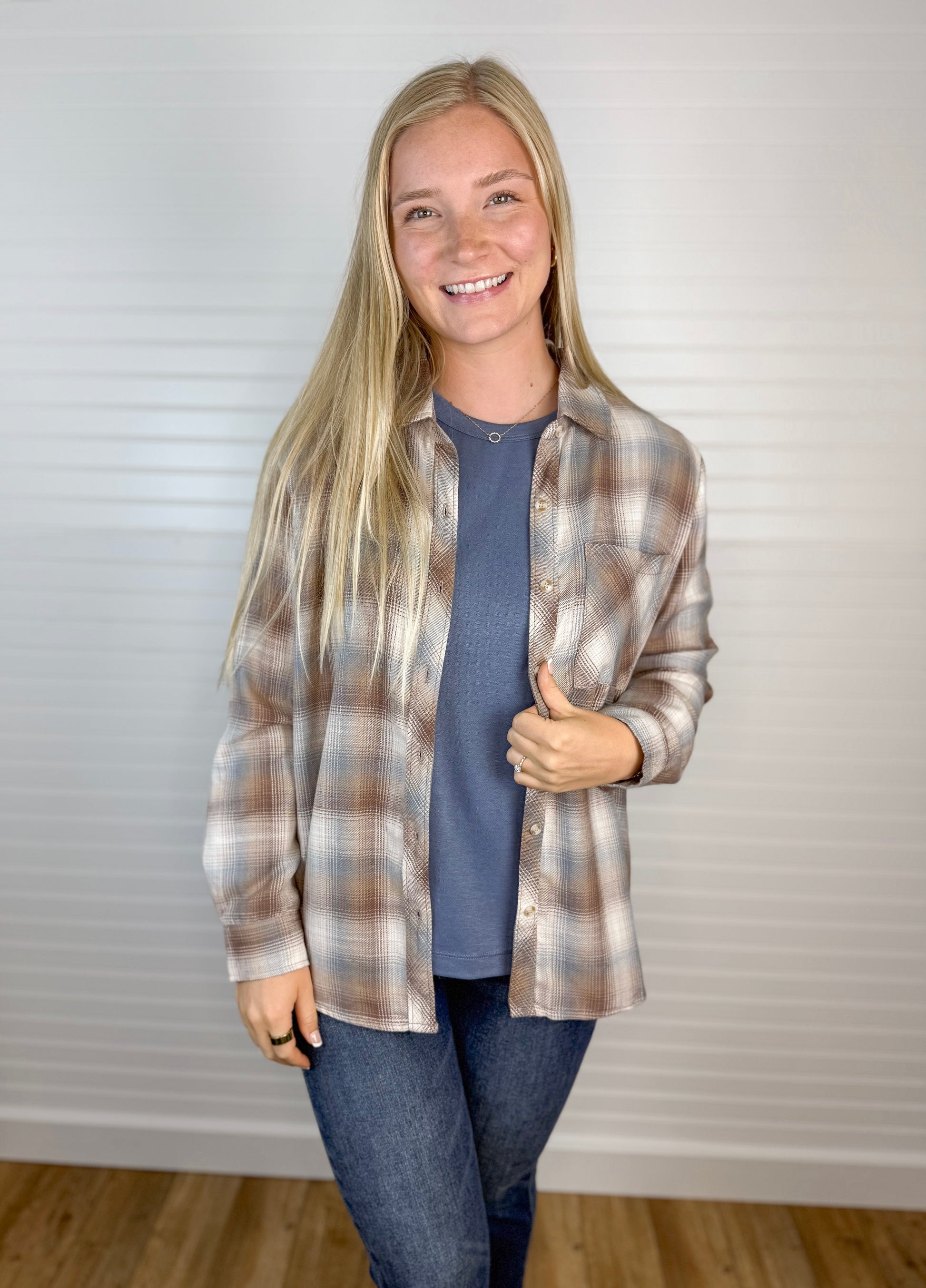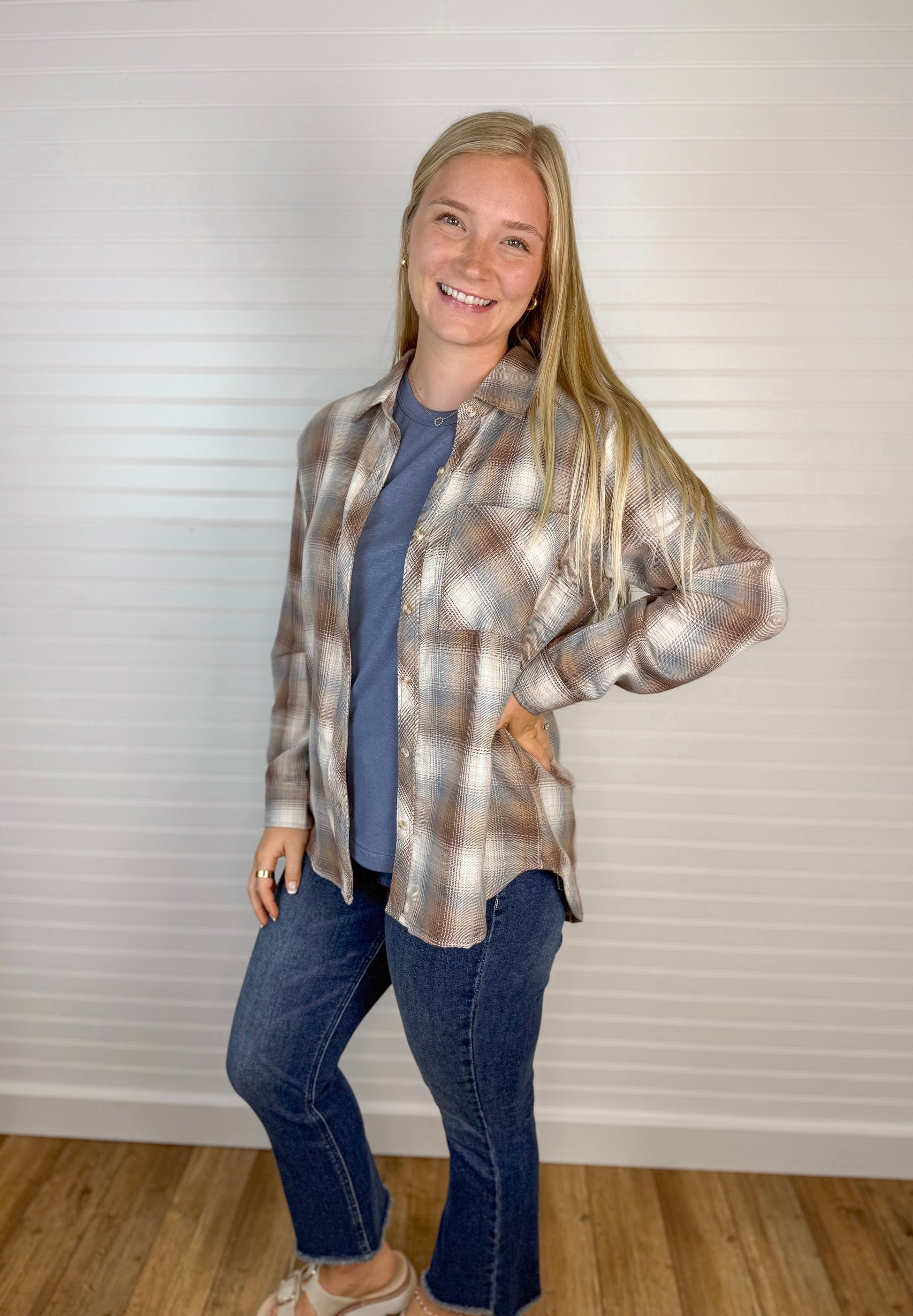 This plaid flannel shirt in mocha features a relaxed, oversized fit with a button-down front and a single chest pocket. Designed with long sleeves, a collared neck, and drop shoulders, it offers comfort and style. The round hem with side slits falls below the hip for easy layering. Made from ultra-soft fabric, it’s perfect for casual, cozy wear.
