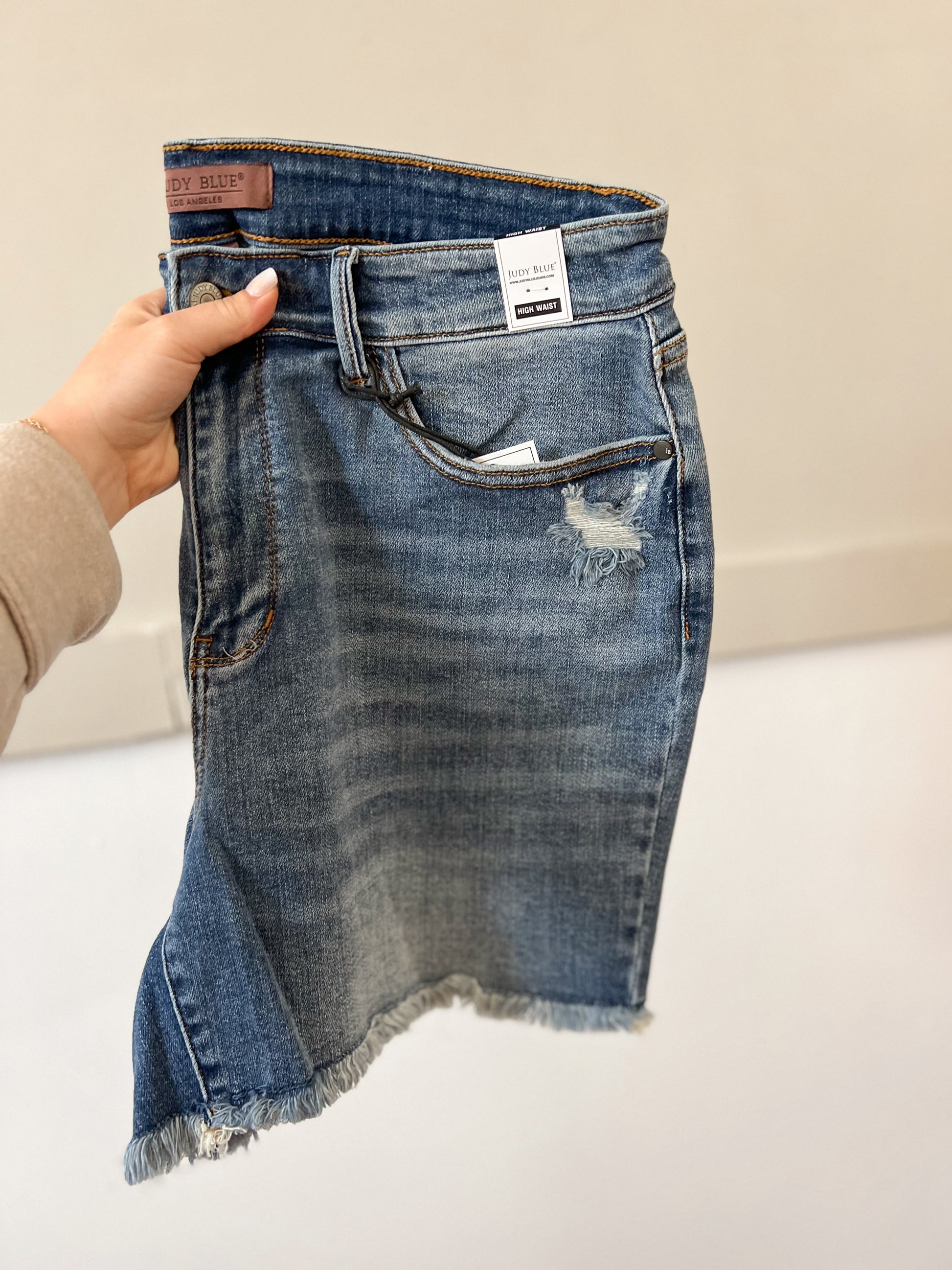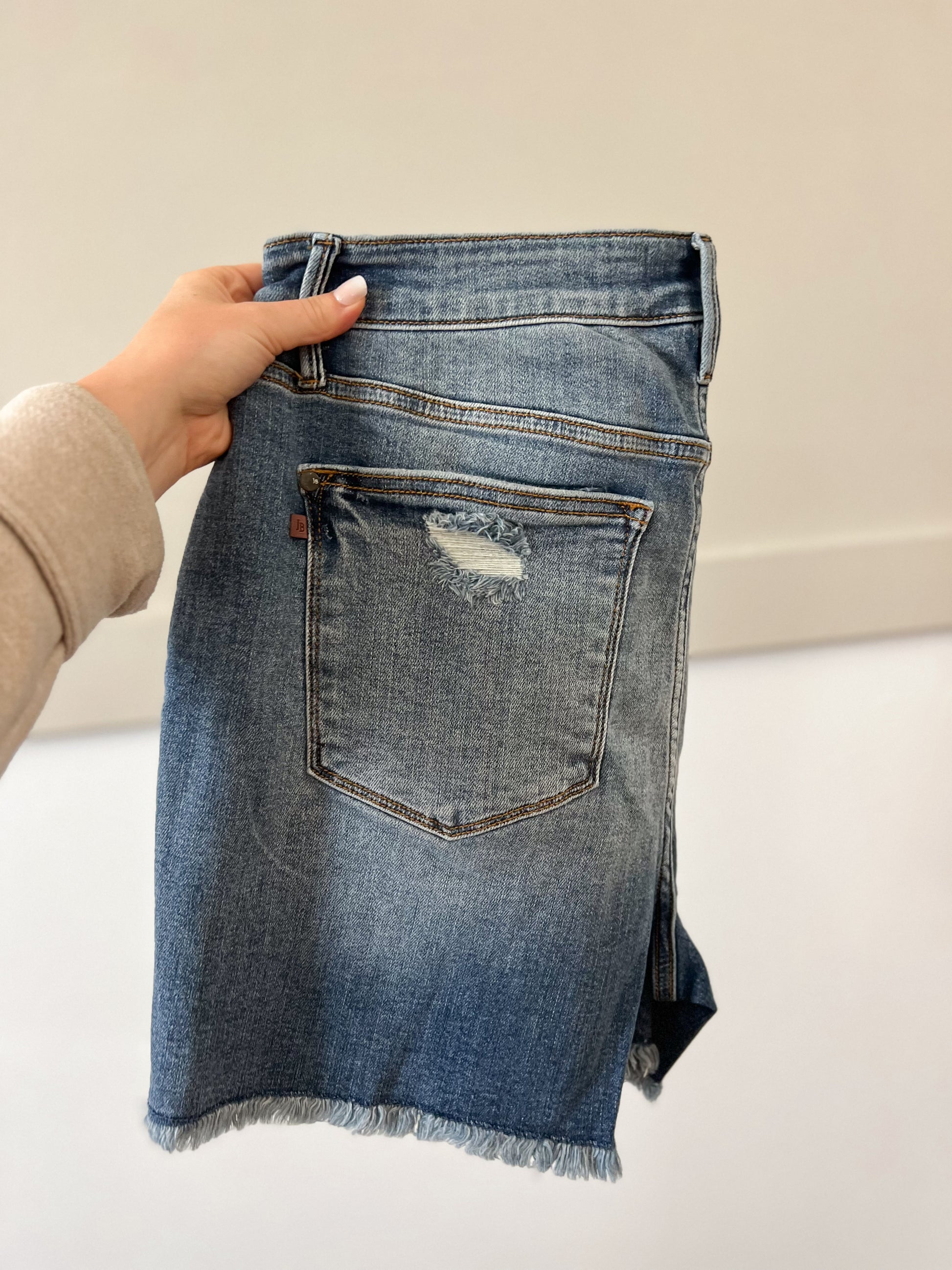 Effortlessly stylish, PLUS Judy Blue Denim Shorts are made with 93% cotton, 6% polyester, and 1% spandex for a comfortable and flattering fit. Featuring a high-waisted vintage wash and a trendy frayed hem, these shorts have a 12" rise and 5" inseam. Perfect for any summer occasion!