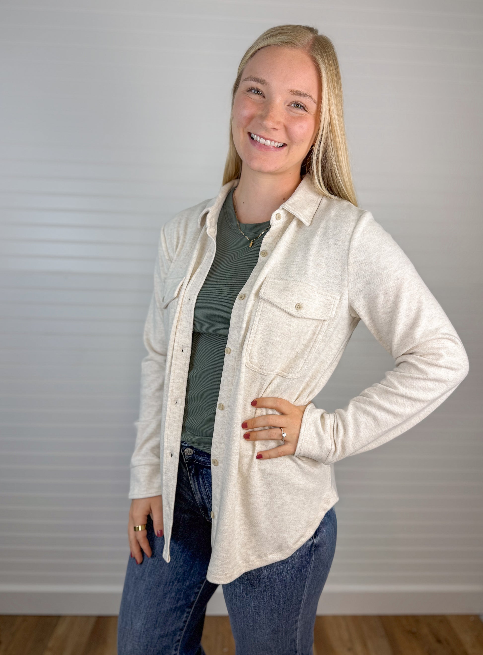 This Plush Soft Lightweight Shacket features a collared neckline and button-front closure for easy styling. It includes dual chest pockets and a shirt tail hem for a casual look. Made from a comfortable blend of polyester, viscose, and elastane, it offers softness with a slight stretch. The size small measures 27" in length and 19.5" across the chest, providing a comfortable fit.
