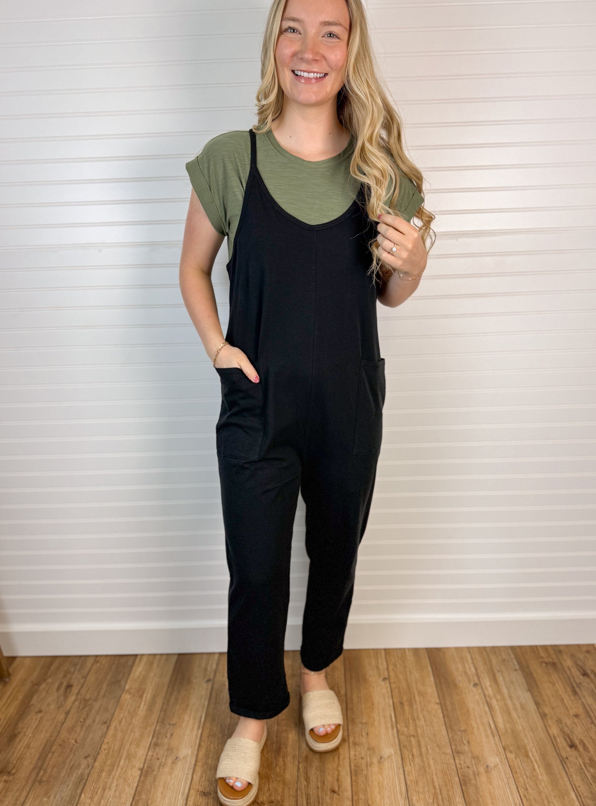 Effortless style meets everyday comfort in this spaghetti strap jumpsuit. Crafted from soft, stretchy knit fabric, it features a relaxed fit that moves with you and functional pockets for practicality. Perfect for casual outings, weekend errands, or laid-back gatherings. The timeless black hue pairs easily with your favorite accessories.