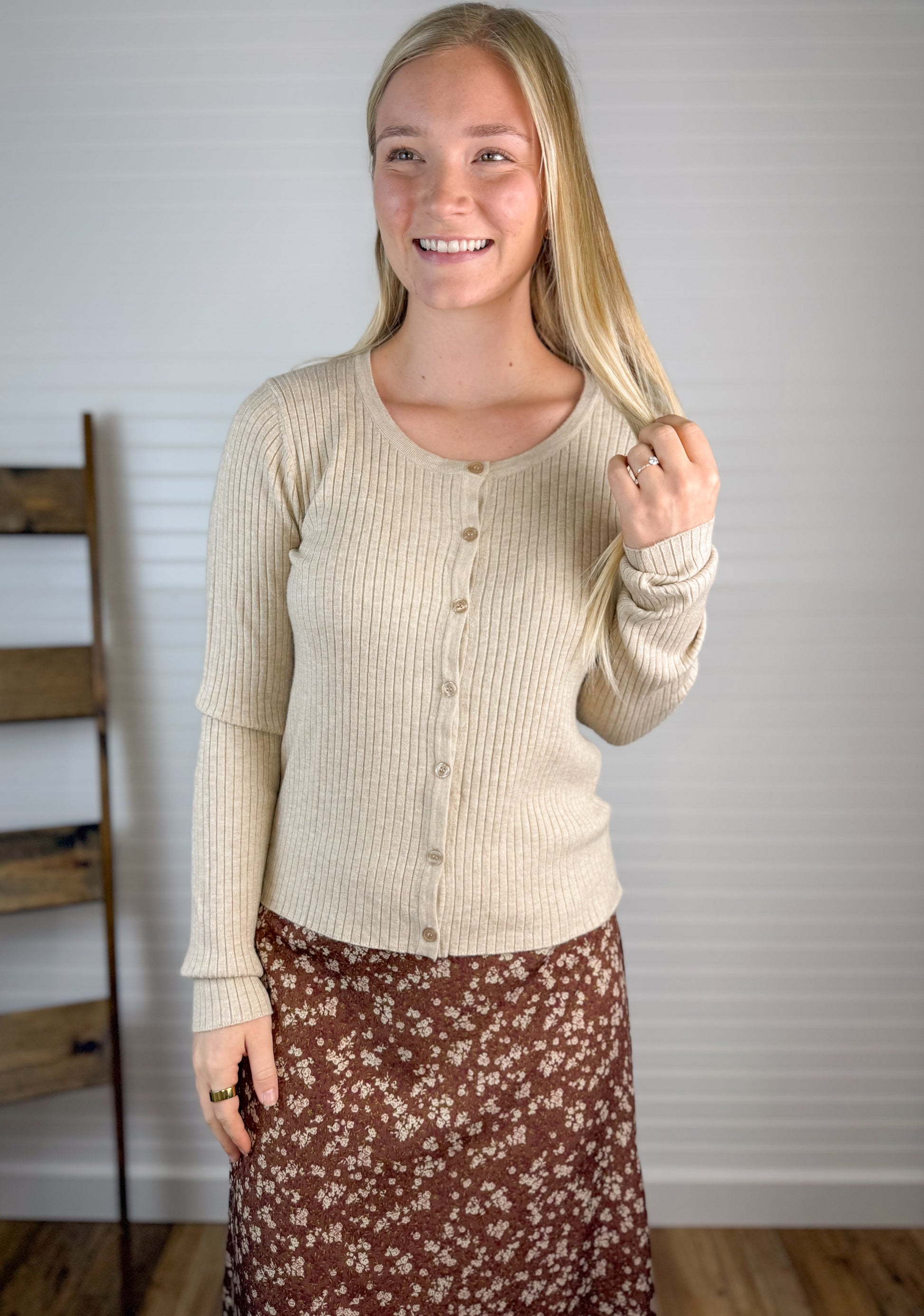 This Ribbed Button Down Cardigan in Sand is soft and lightweight, making it comfortable for all-day wear. Its versatile design pairs beautifully with skirts, adding a cozy yet stylish layer to your outfit. Perfect for casual or dressy occasions.