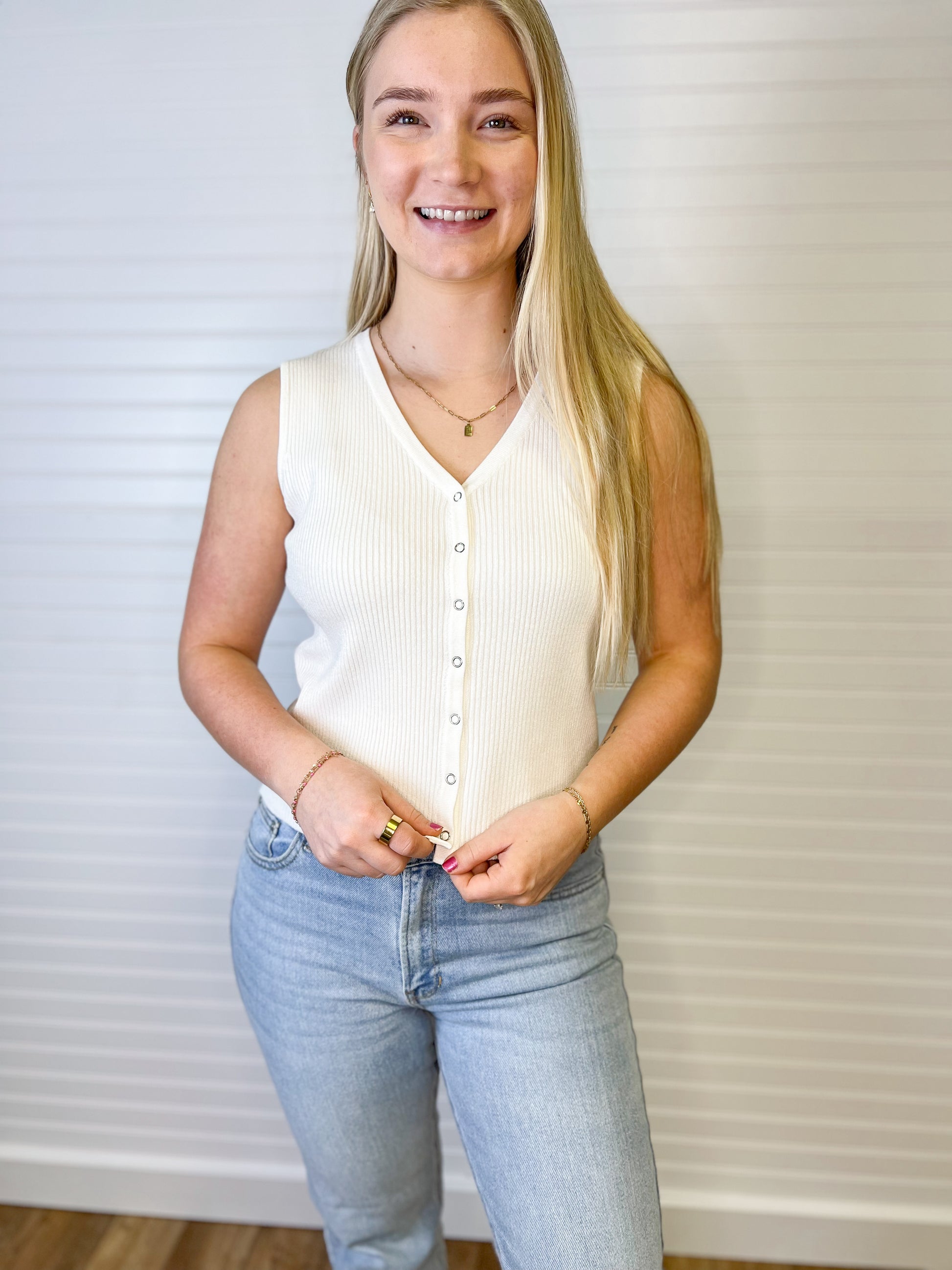 Ribbed Knit Button-Up Sweater Tank - Ivory