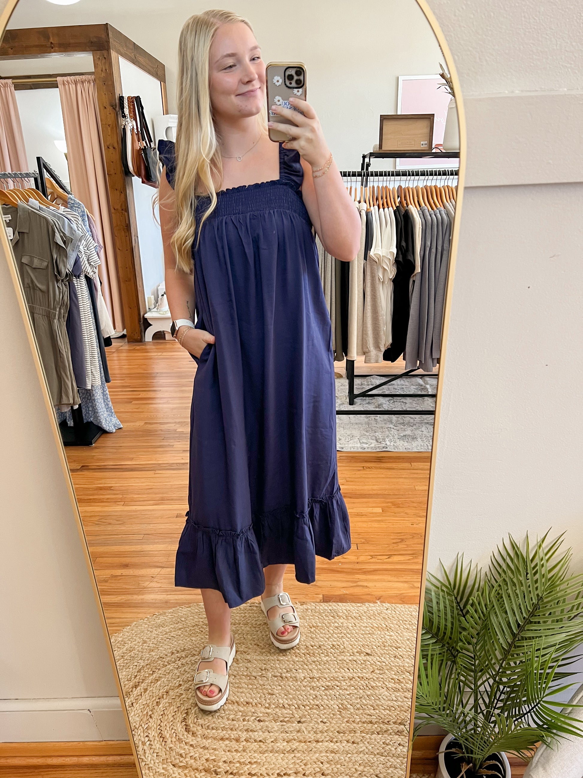 Ruffle sleeve midi dress with a smocked, square neckline, side pockets, and elastic straps