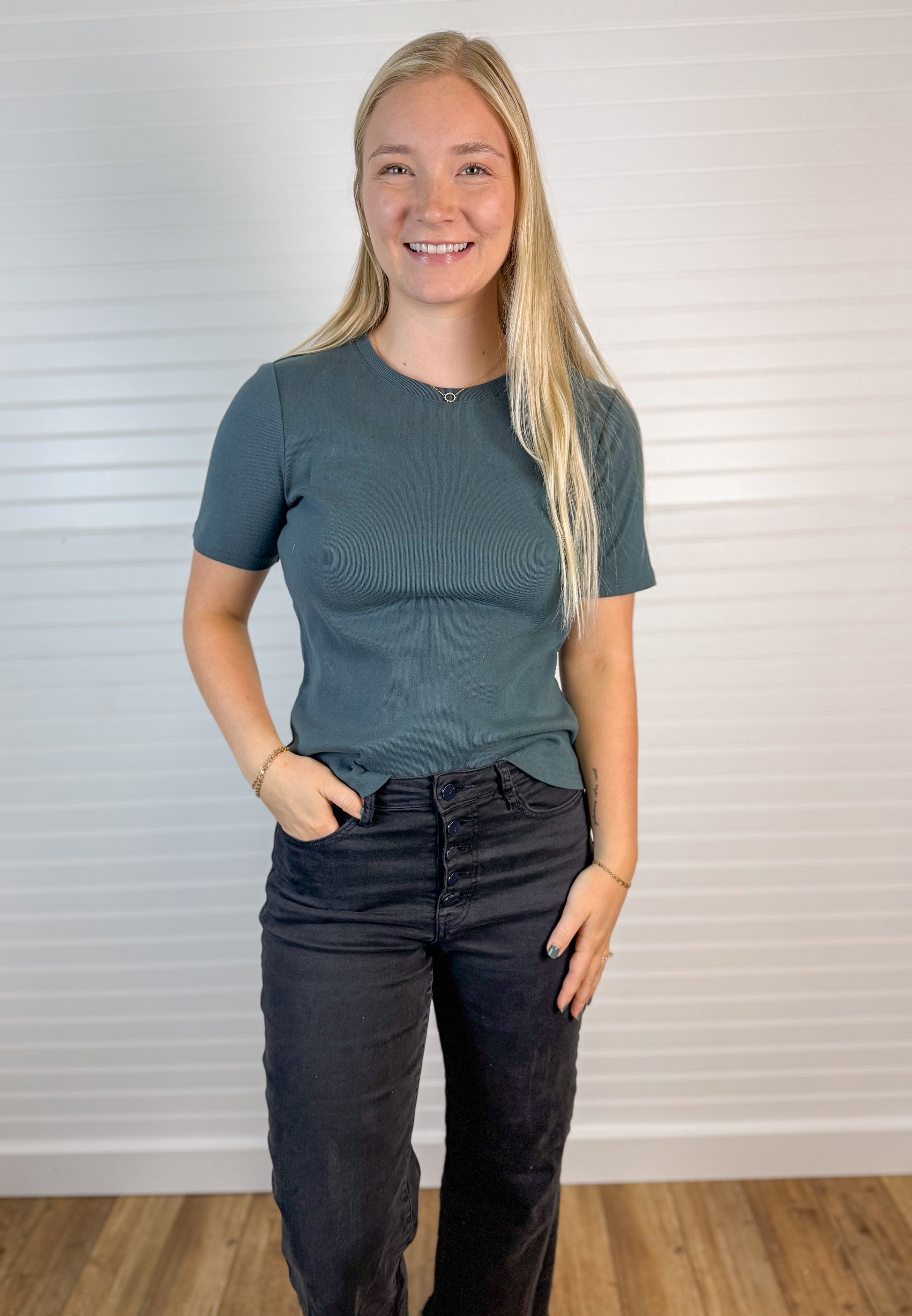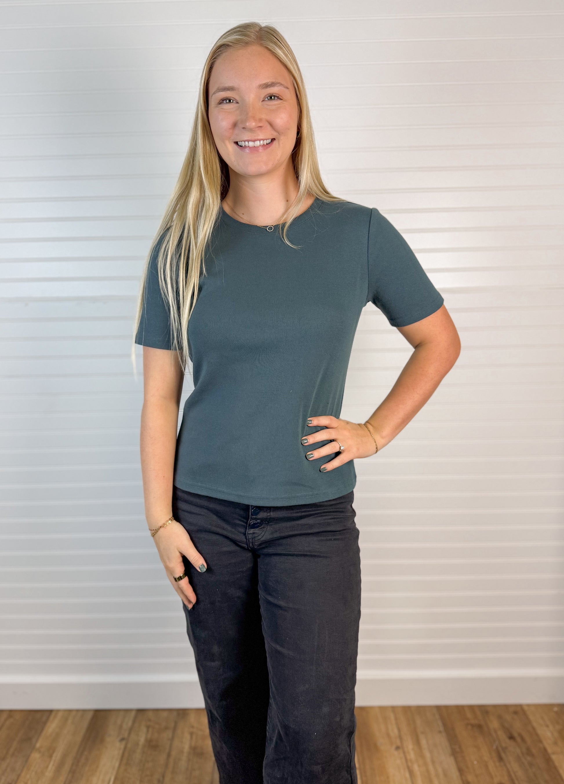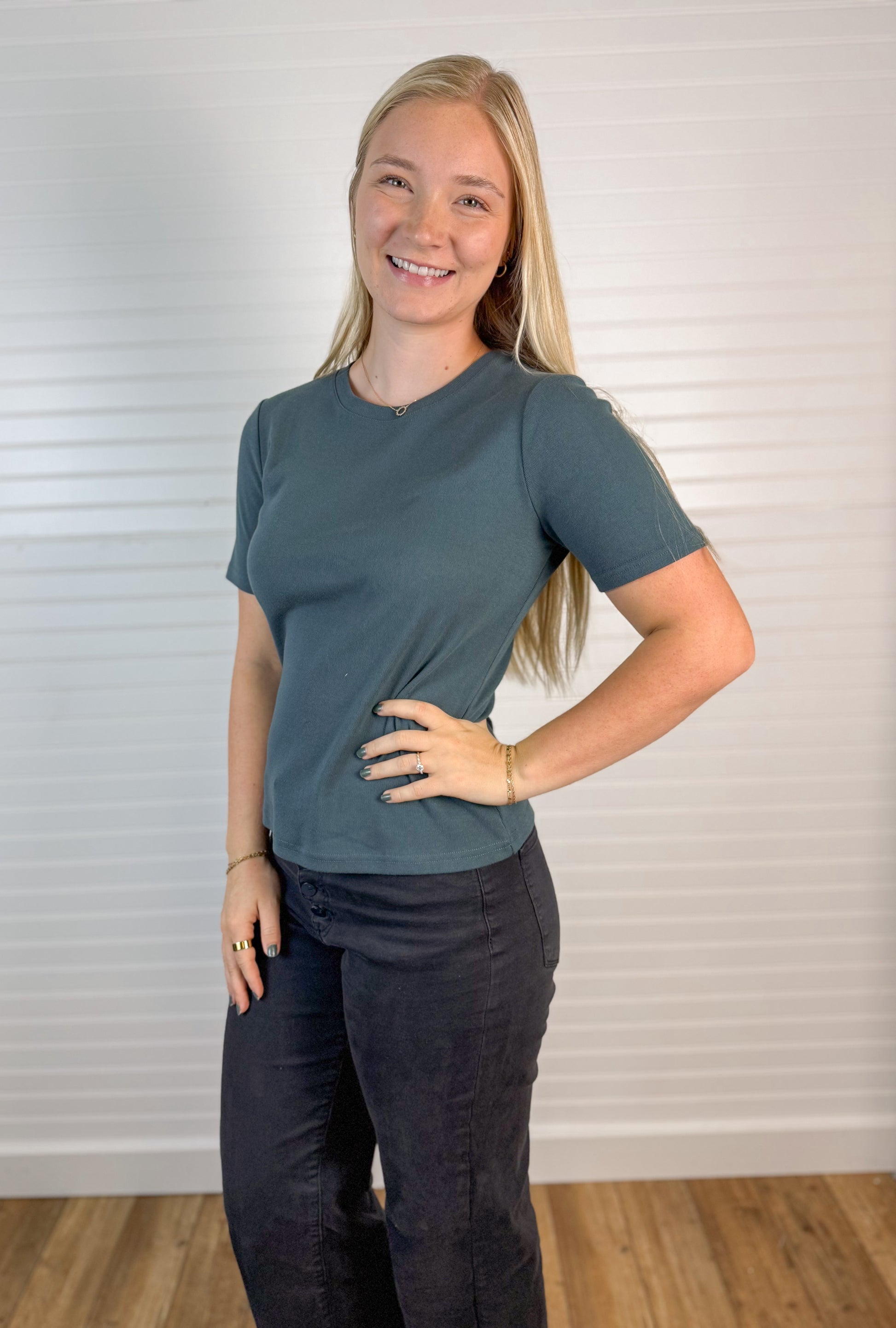The Sammie Relaxed Fit Tee in blue features a comfortable crew neck and a relaxed fit for everyday wear. Made from 100% cotton, it offers softness and breathability. Size small measurements include a length of 22.5", chest width of 16", and sleeve length of 8.5", providing a casual and easygoing style.