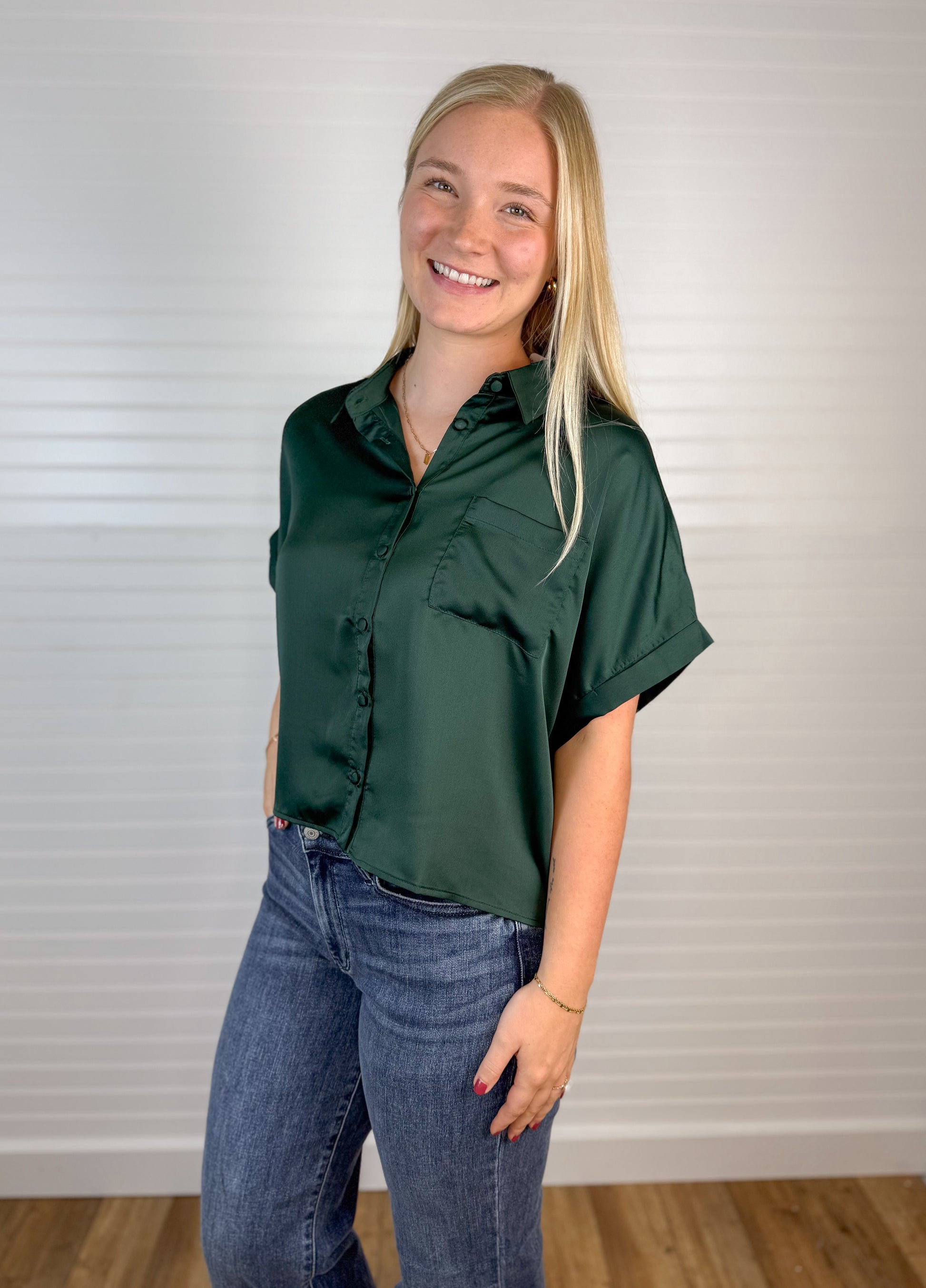 Satin Button Down Blouse - Hunter Green