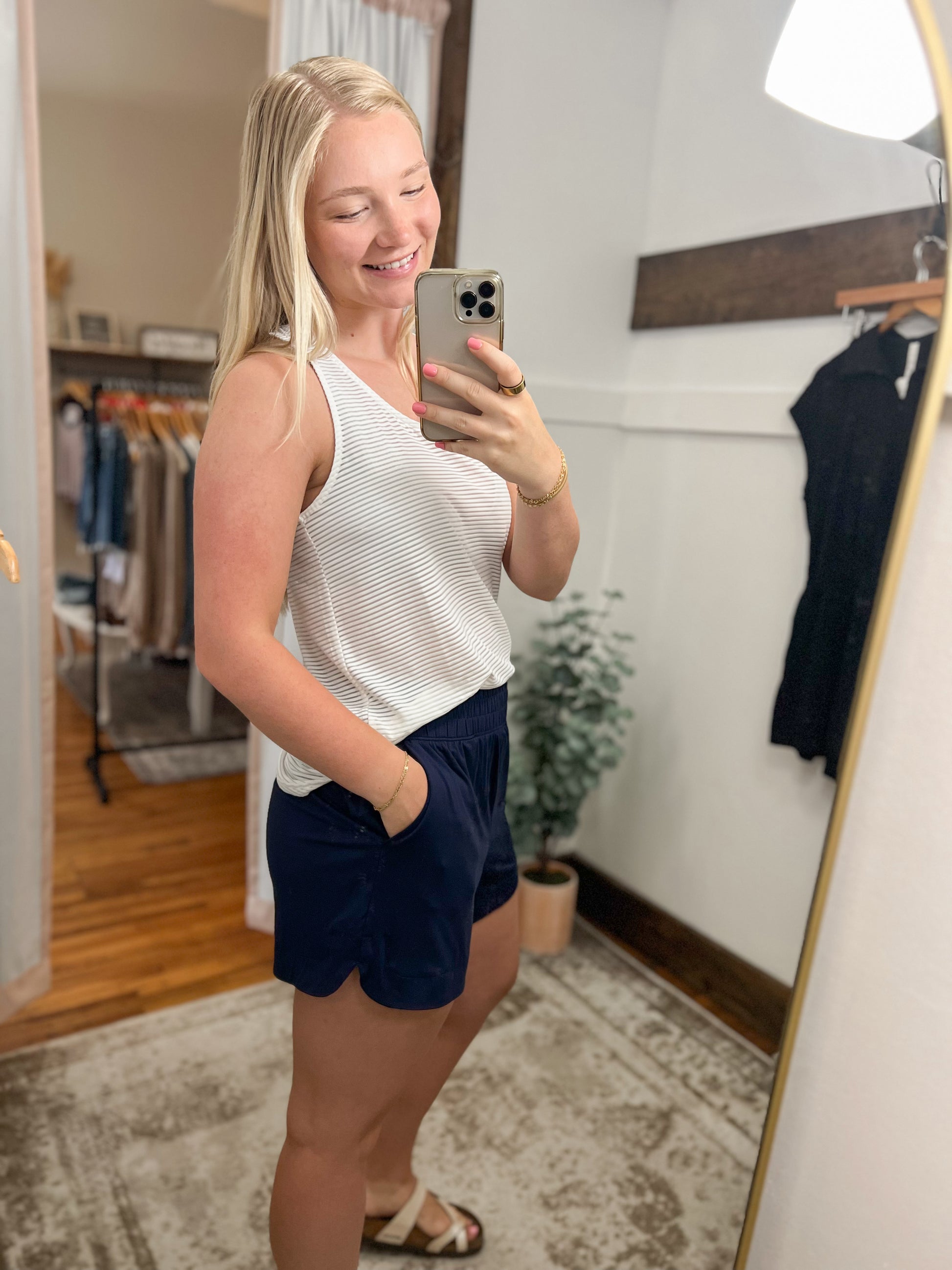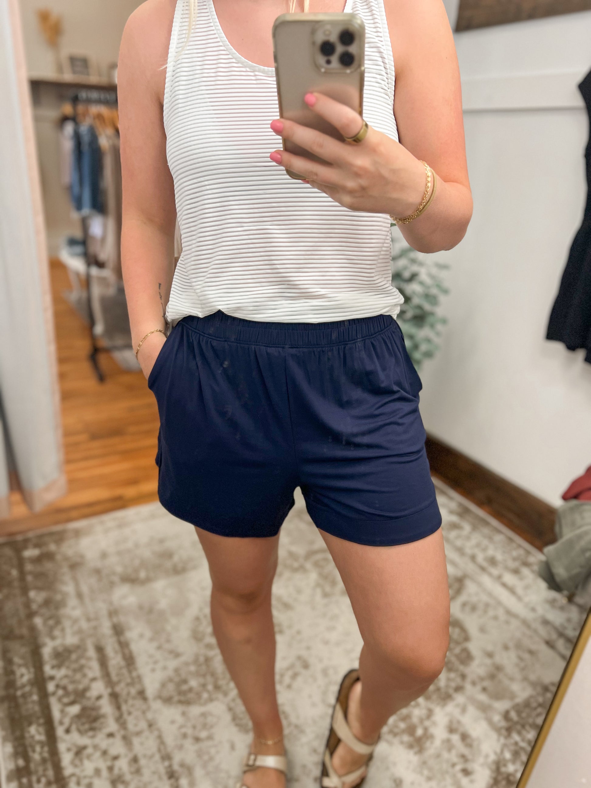 These Smooth Tulip Shorts in Navy are made from high-quality viscose modal fabric that feels silky smooth and lightweight. Designed with moisture-wicking and 4-way stretch features, they provide comfort and flexibility. The high-rise elastic waistband ensures a secure fit, while the tulip scallop side hem adds a delicate detail. With side pockets and a standard fit, these shorts are perfect for relaxing or sleeping in comfort.