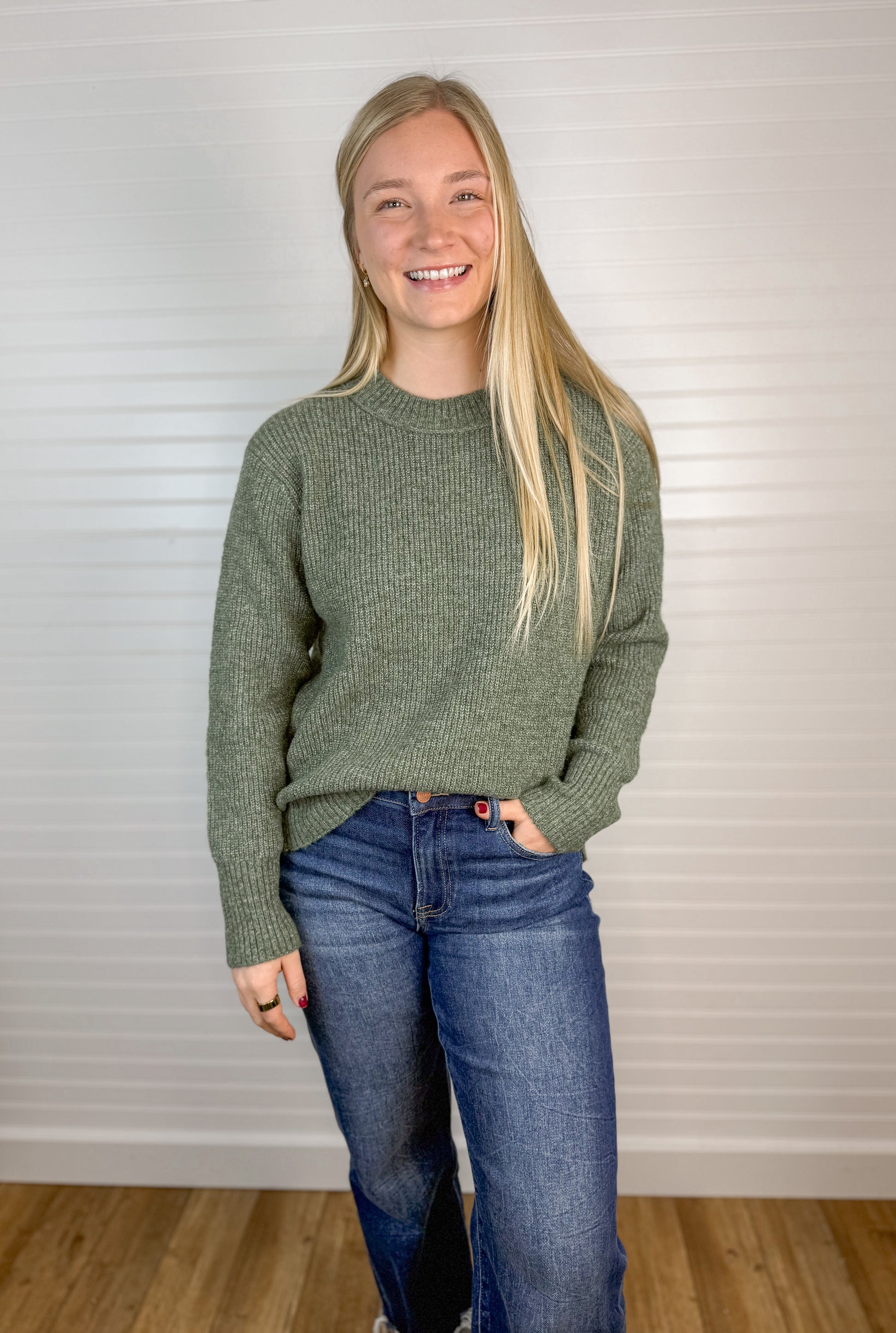 Soft Knit Crewneck Sweater - Dark Sage Cozy and versatile, this ribbed knit sweater features a classic crewneck design in a rich dark sage tone. The soft fabric drapes beautifully while the ribbed texture adds subtle visual interest and structure.