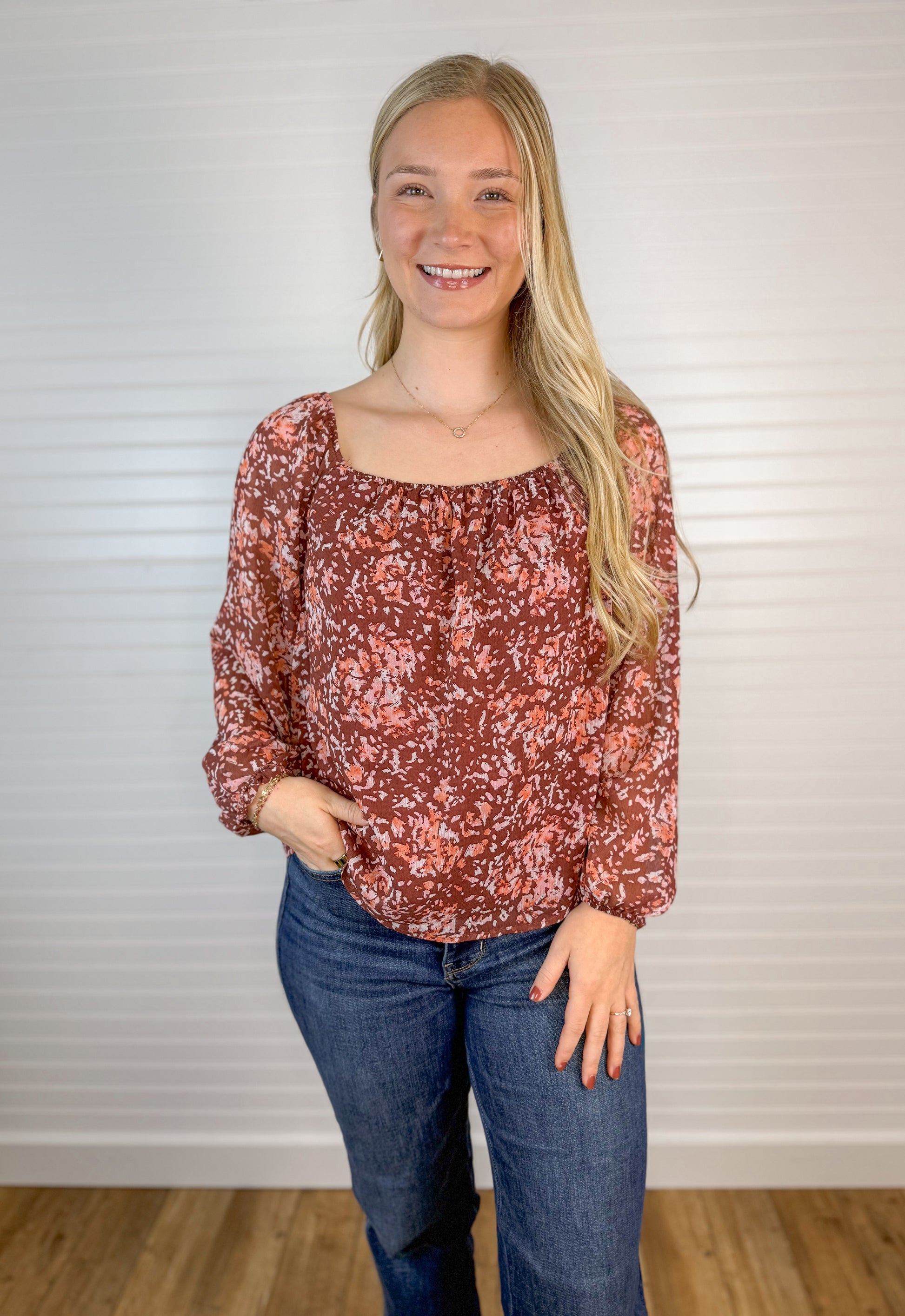 This long-sleeve top features a charming square neckline with comfortable elastic detailing for a perfect fit. The rich wine color combined with a floral pattern adds elegant style to your everyday wardrobe. Designed for both comfort and a flattering silhouette, it’s an easy piece to dress up or down.