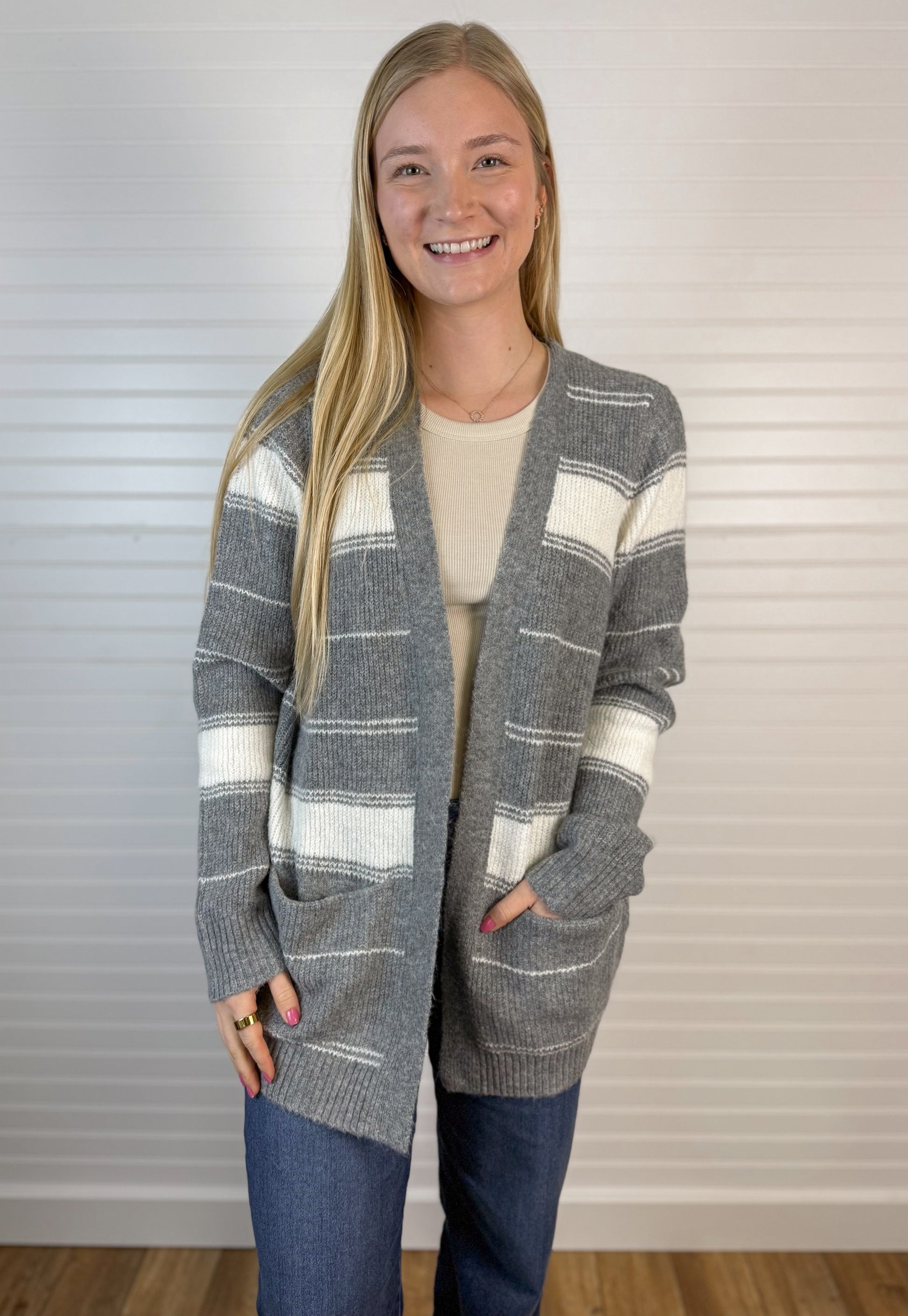 Striped Open Cardigan - Cream/Gray