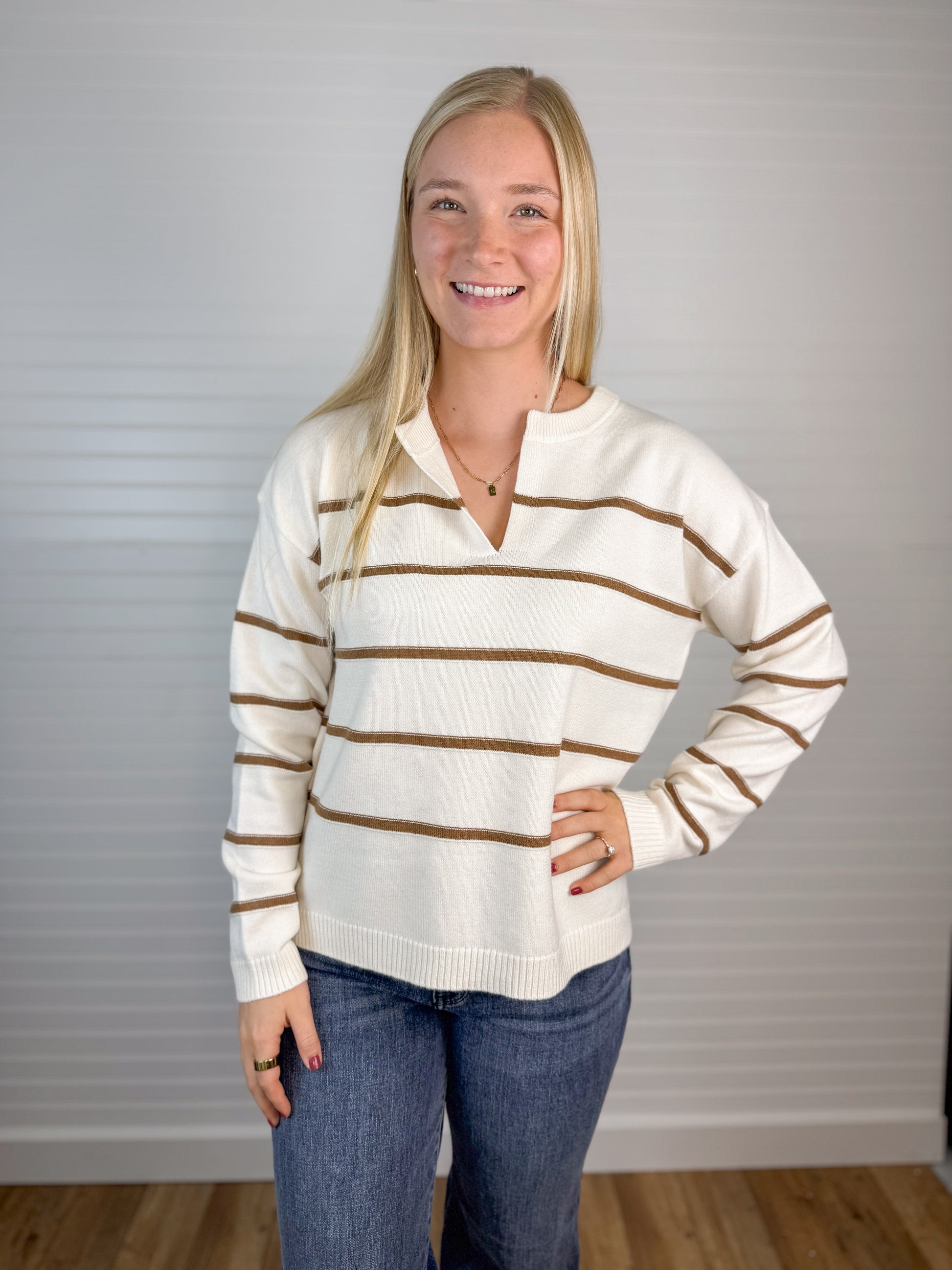 Striped V-Neck Sweater - Cream/Mocha