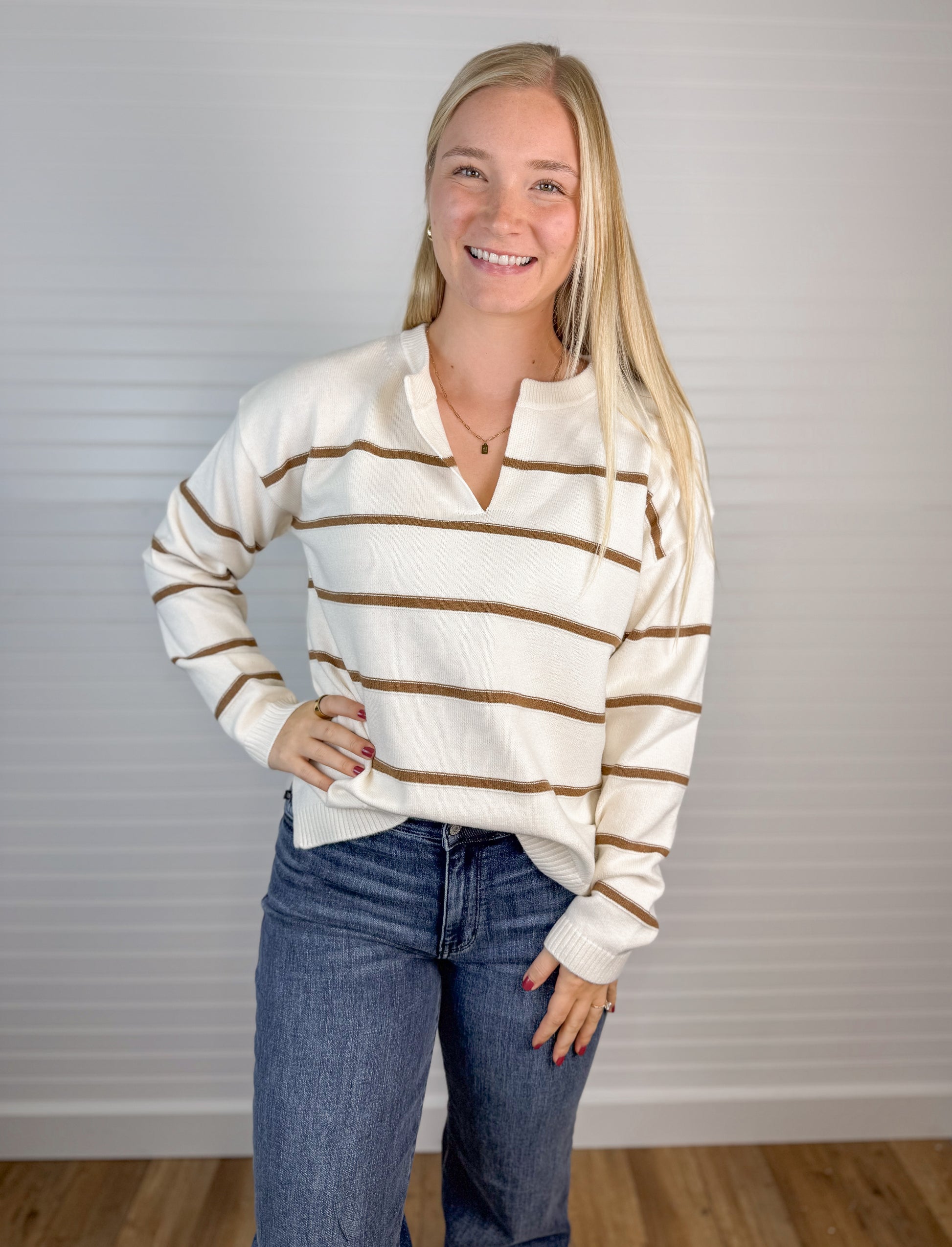 Stay cozy and stylish with this Striped V-Neck Sweater in Cream and Mocha. Made from a soft blend of 70% polyester, 20% acrylic, and 10% nylon, it offers warmth and durability without sacrificing comfort. The classic stripes and flattering V-neck make it an easy choice for everyday wear.
