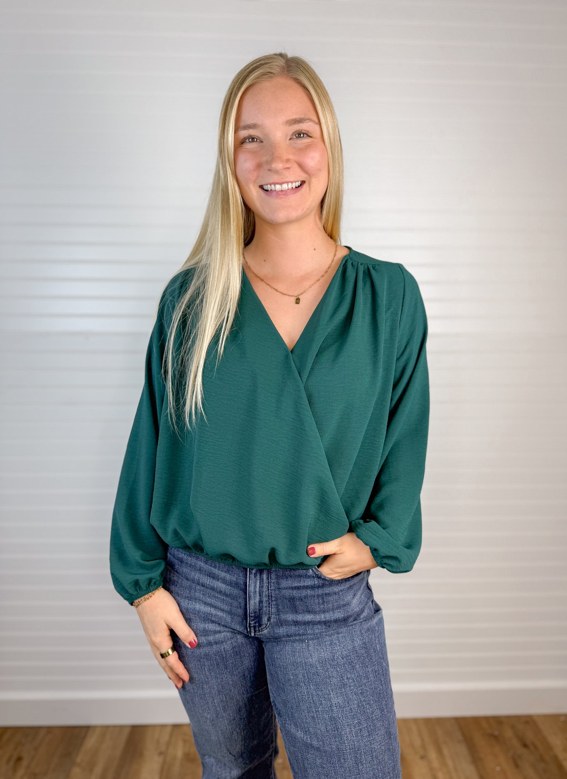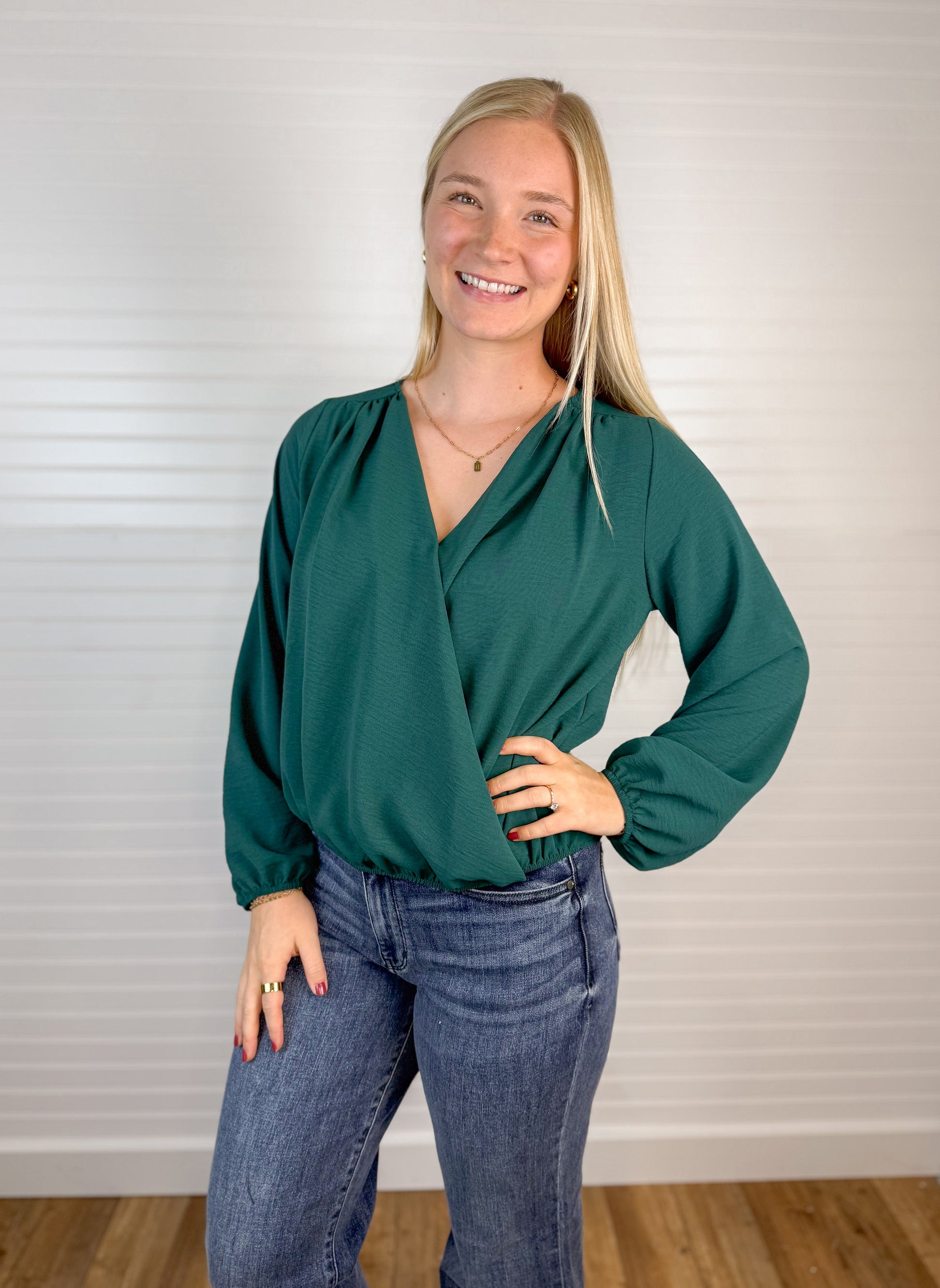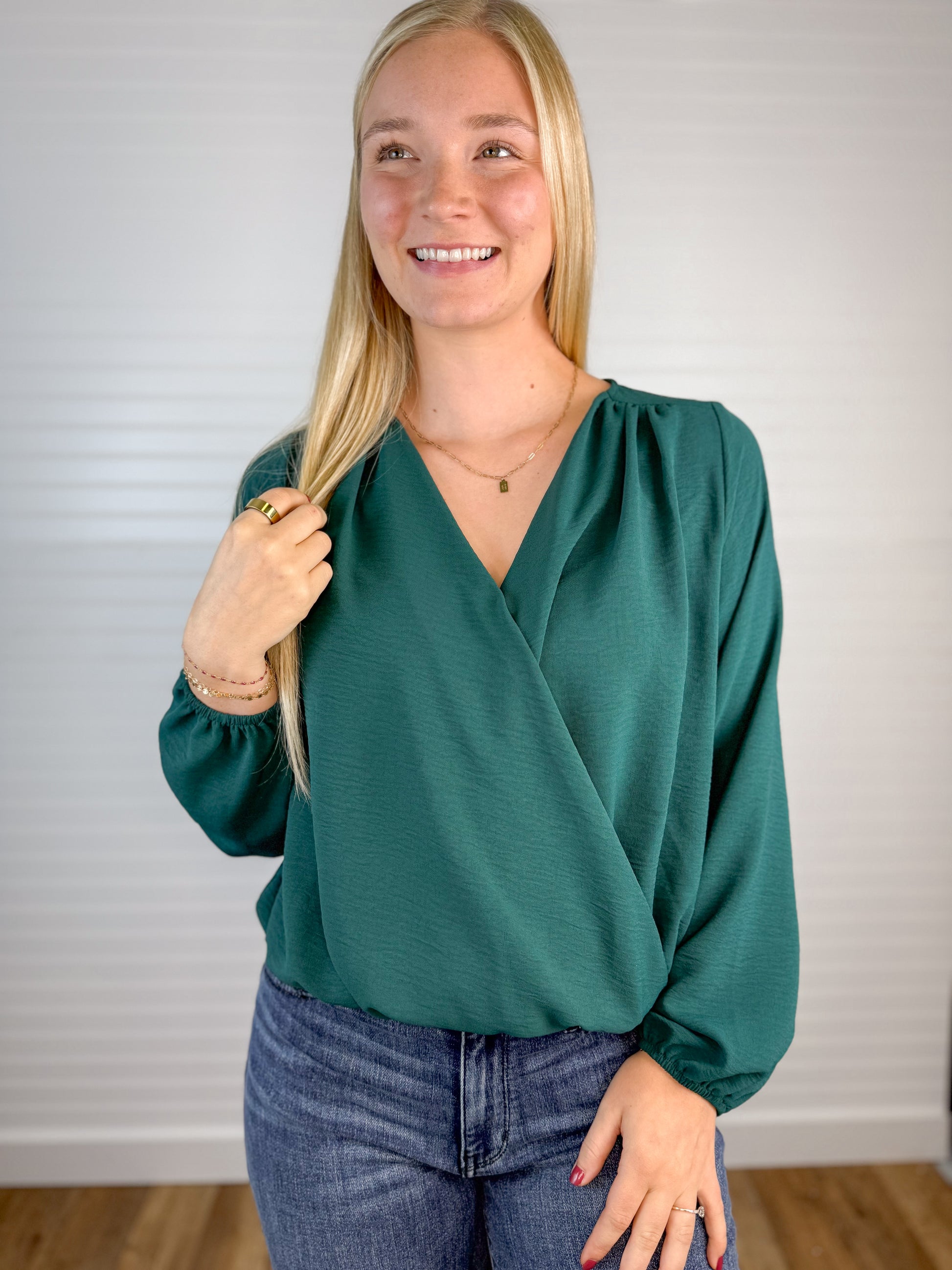 This hunter green surplice long sleeve blouse features a graceful shoulder stirring design and an elegant chest snap closure for ease and style. Its flattering fit adds a polished touch to any outfit, making it perfect for both professional and casual occasions.