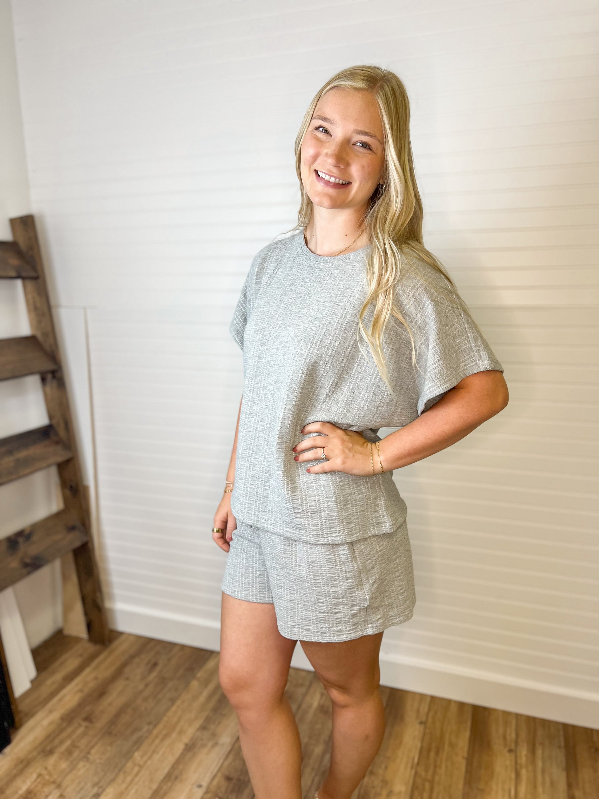 This gray set features a textured knit top with dolman sleeves and matching shorts with an elastic waistband. Designed for a loose, comfortable fit, it’s perfect for relaxed, everyday wear.