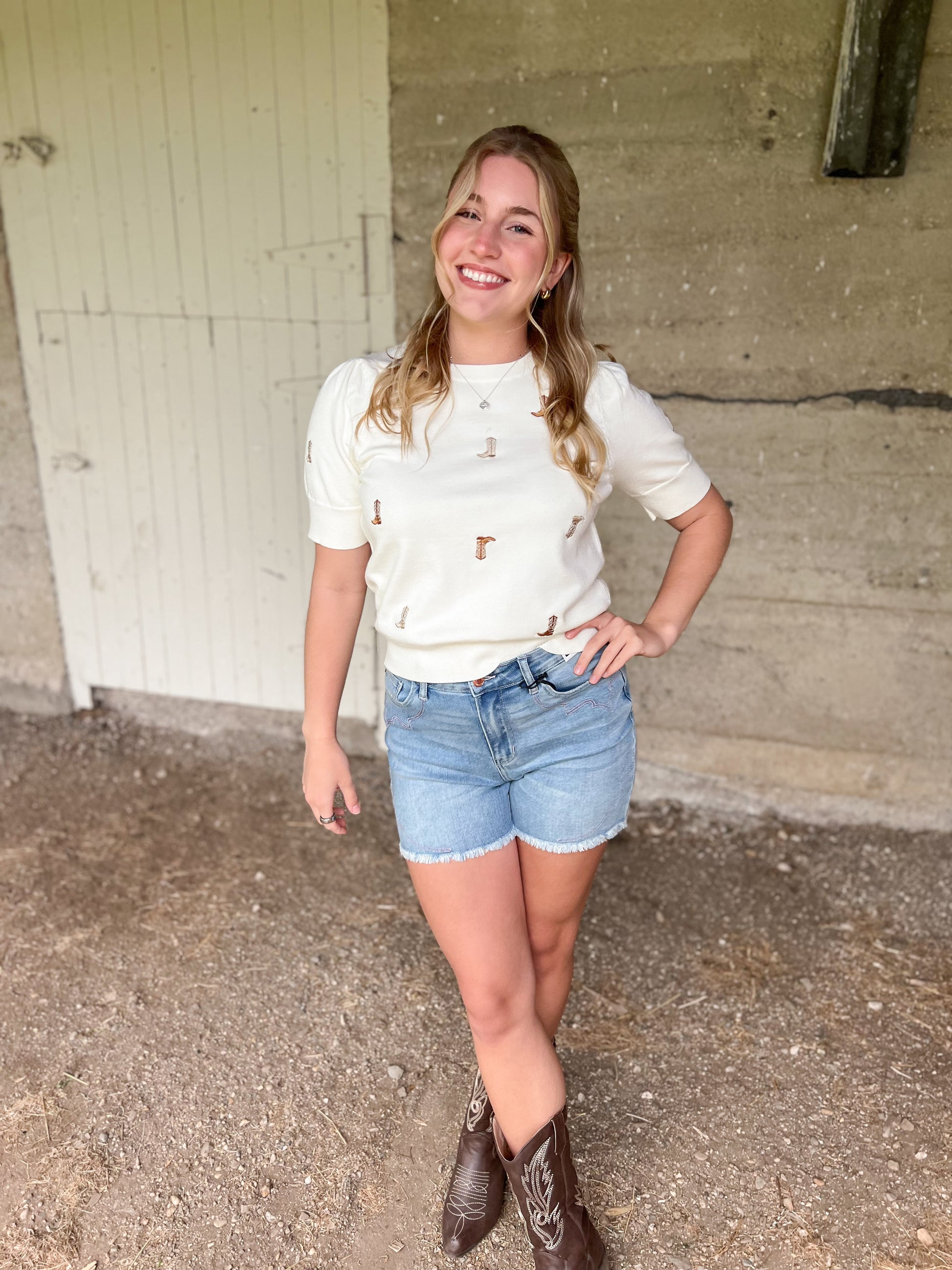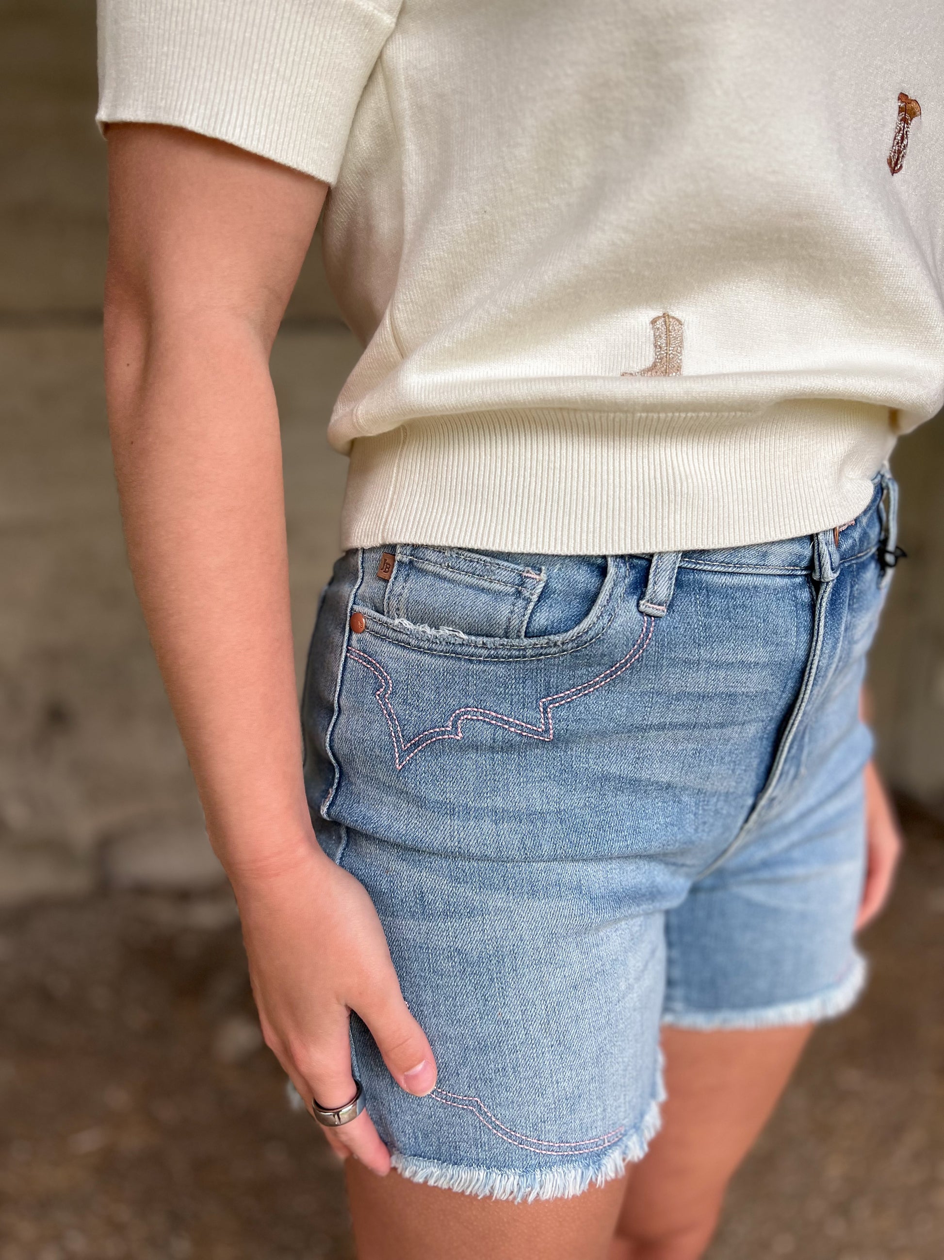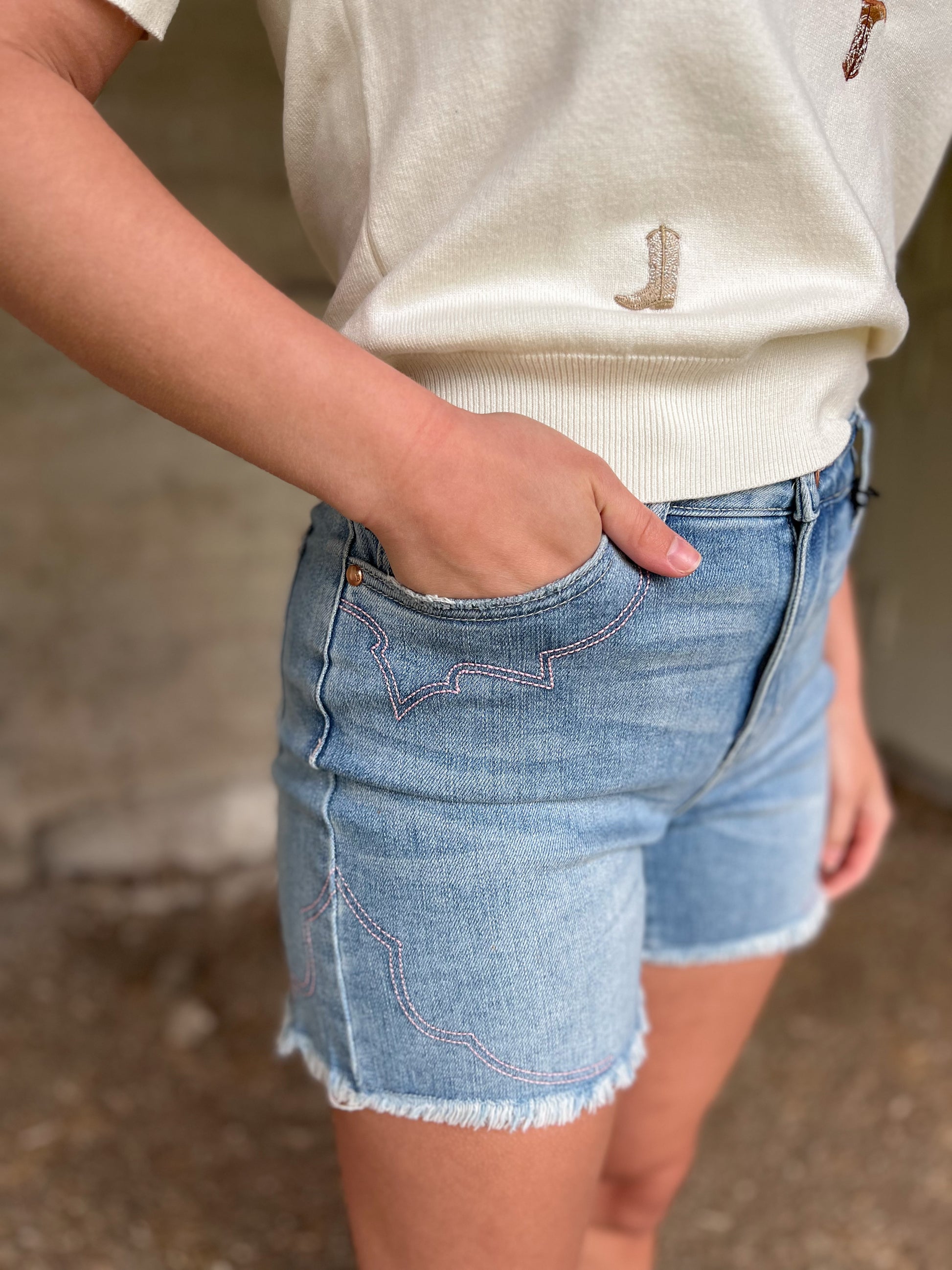 These denim shorts feature a unique western embroidery design in the front for a touch of western charm. Made with a blend of cotton, polyester, and spandex, they offer comfort and stretch for all-day wear. With an 11" rise and 4" inseam, they provide a flattering fit.
