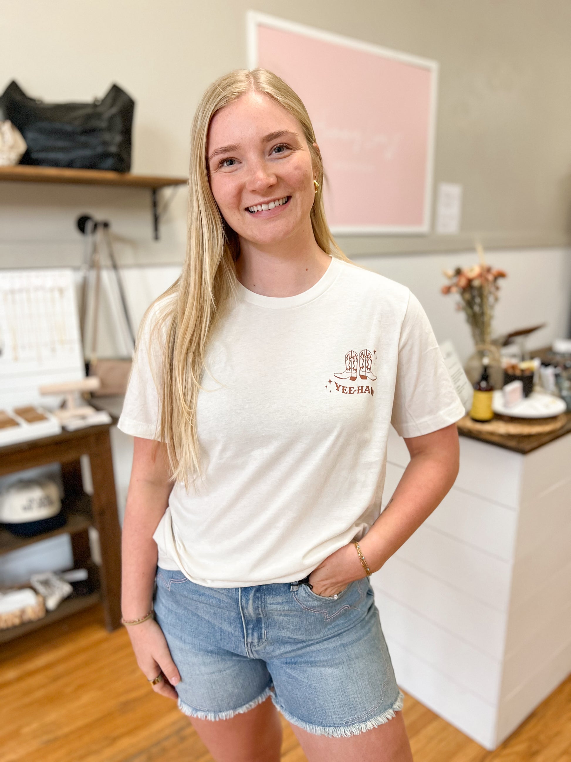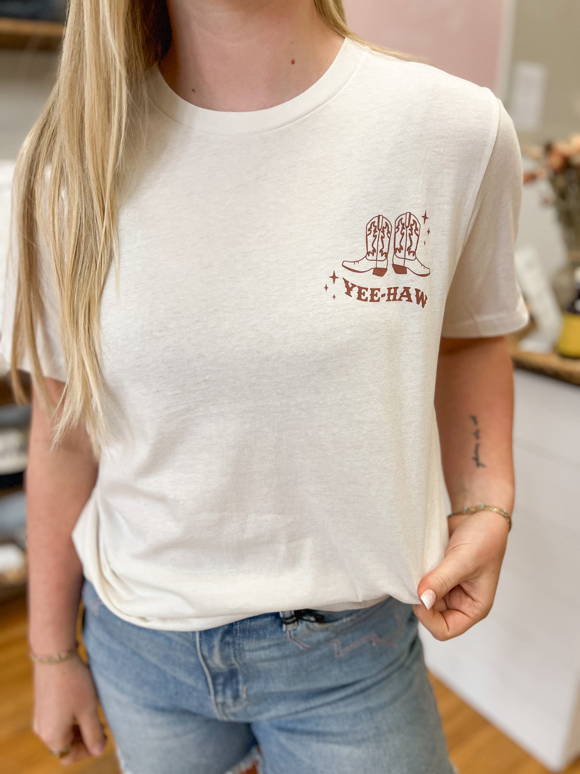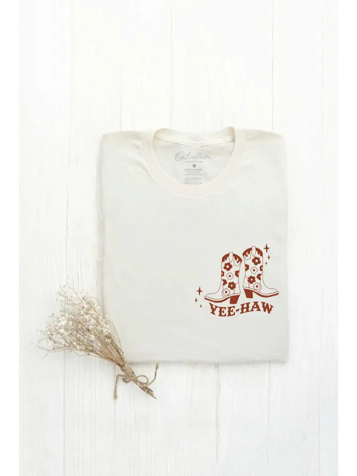 Get ready to embrace your wild side with our Yee-Haw Graphic Tee in Vintage White. Made from 100% cotton for solid colors, or 52% cotton and 48% poly for heather options, this hand screen printed t-shirt is the epitome of comfort and style. Relaxed unisex fit